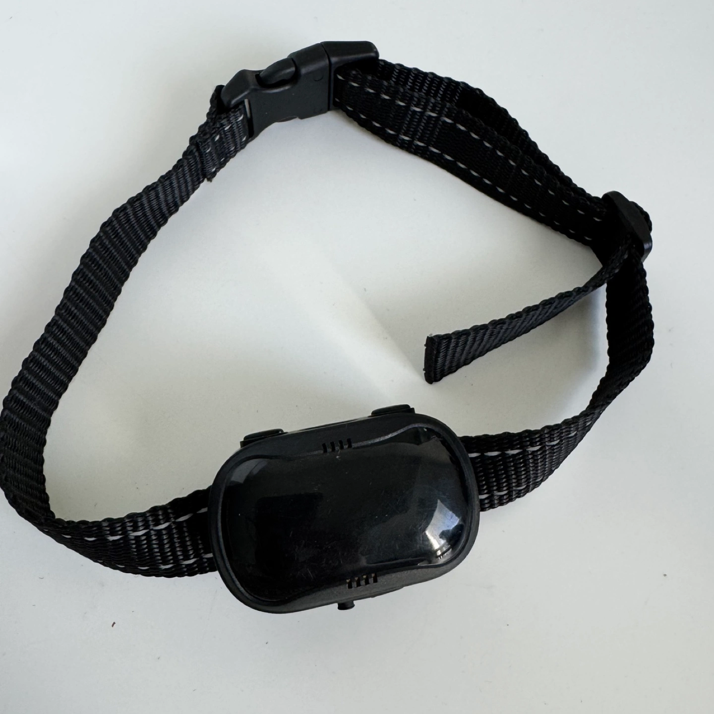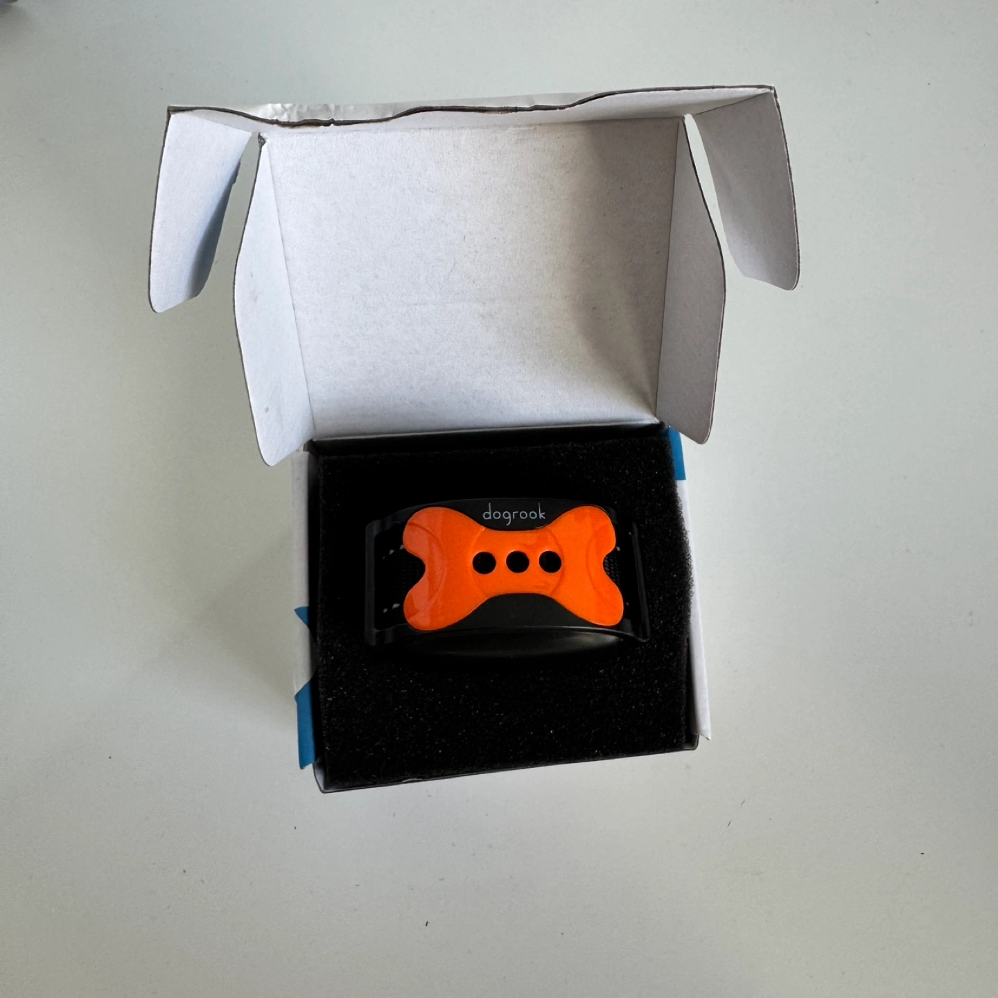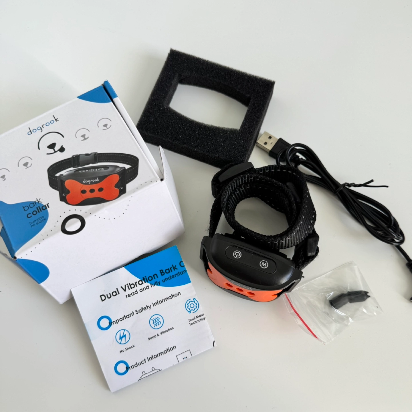 New, unused Dogrook dual vibration bark collar. Includes collar, charging cable, and instructions. No shock function. Suitable for small to medium-sized dogs.