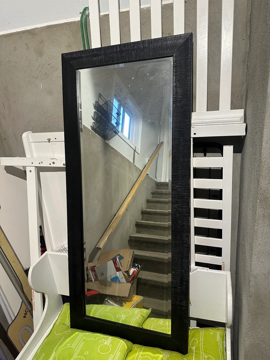 Tall black framed mirror. Perfect for a bedroom or hallway. Simple design, easy to hang. Minor wear.