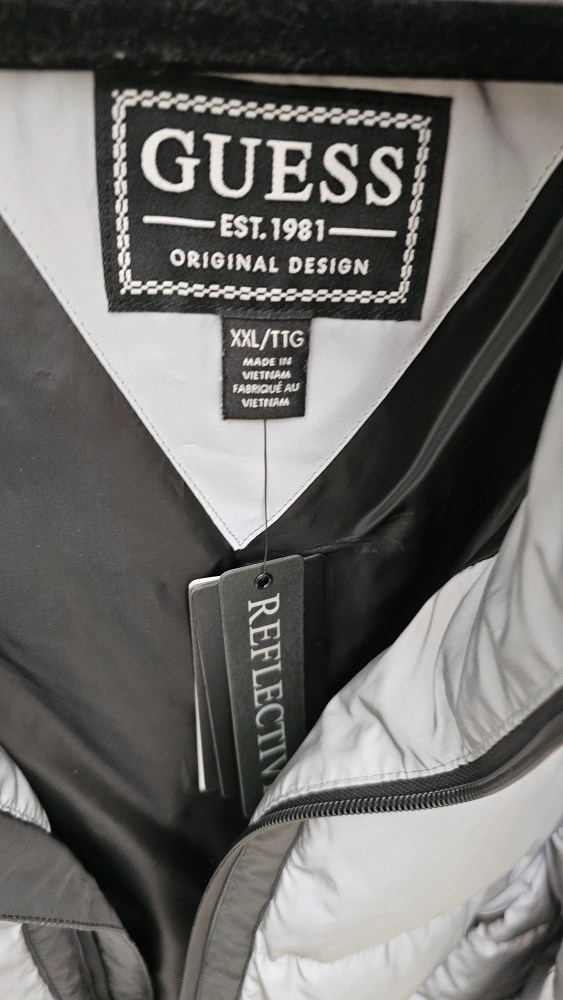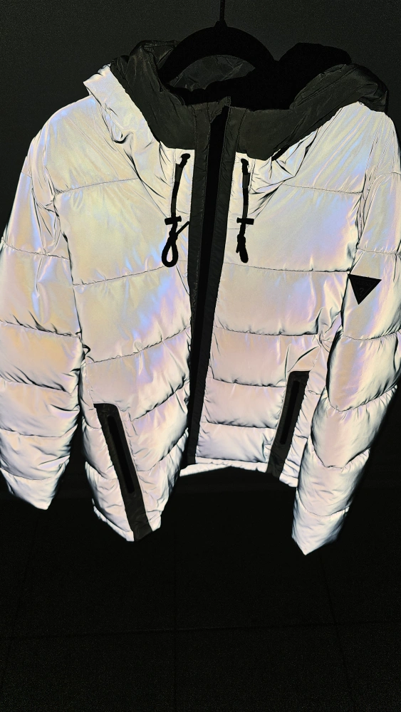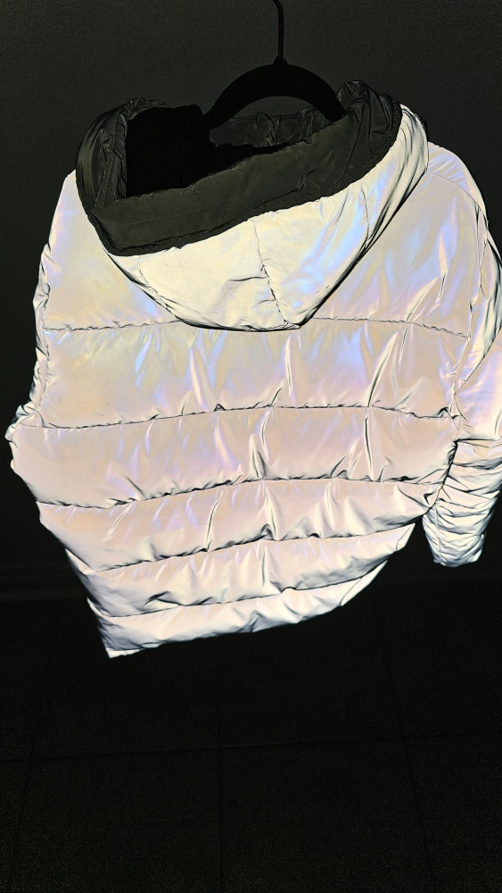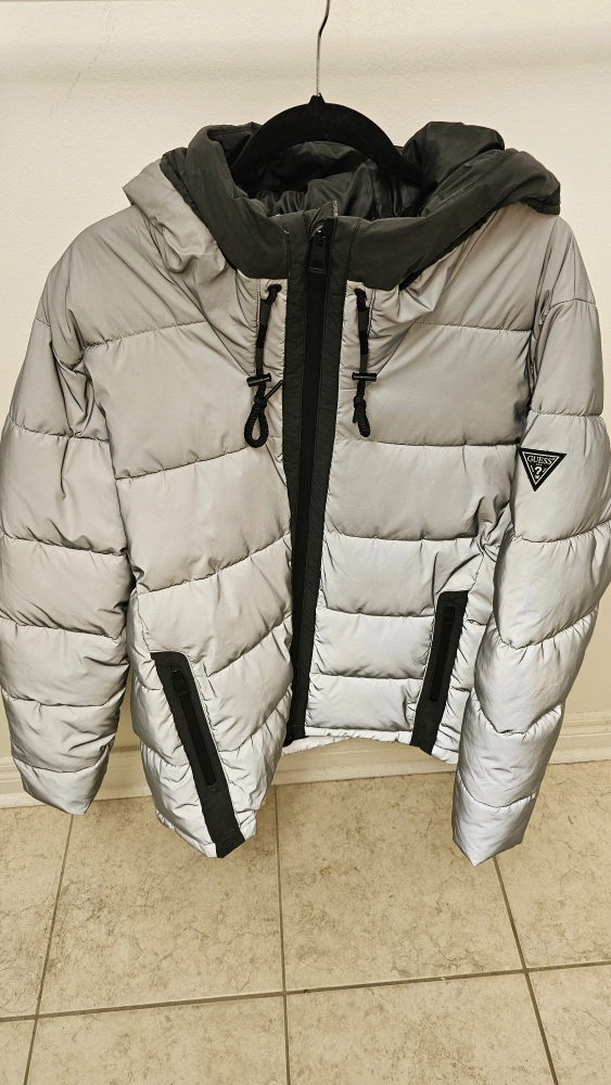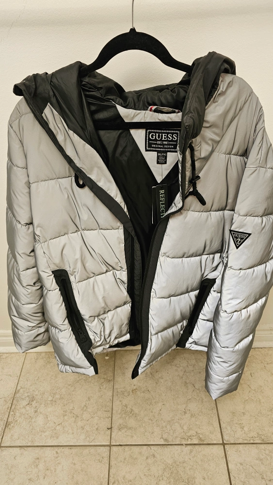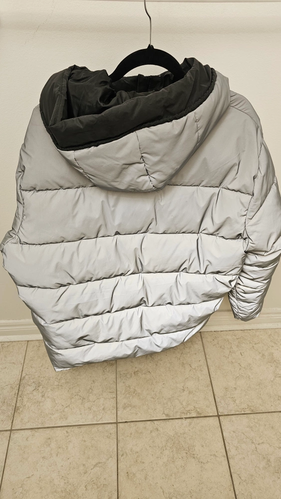 40Silver reflective puffer jacket. Features a black hooded neckline and zipper closure. Side pockets included. Excellent condition and it is brand new with tags still attached.