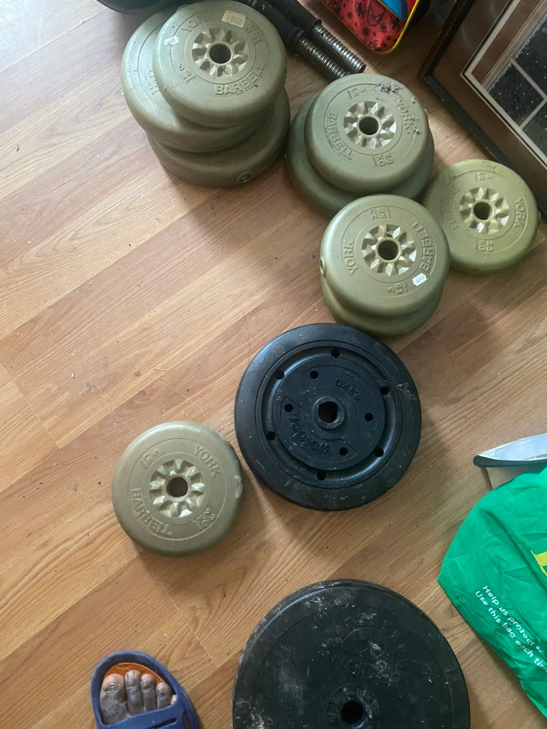 Assorted weight plates, various sizes and weights. York brand visible on some plates. One black Max Weider plate. Also included, a black motorcycle helmet, brand VCAN visible. Pre-owned, some wear and tear.