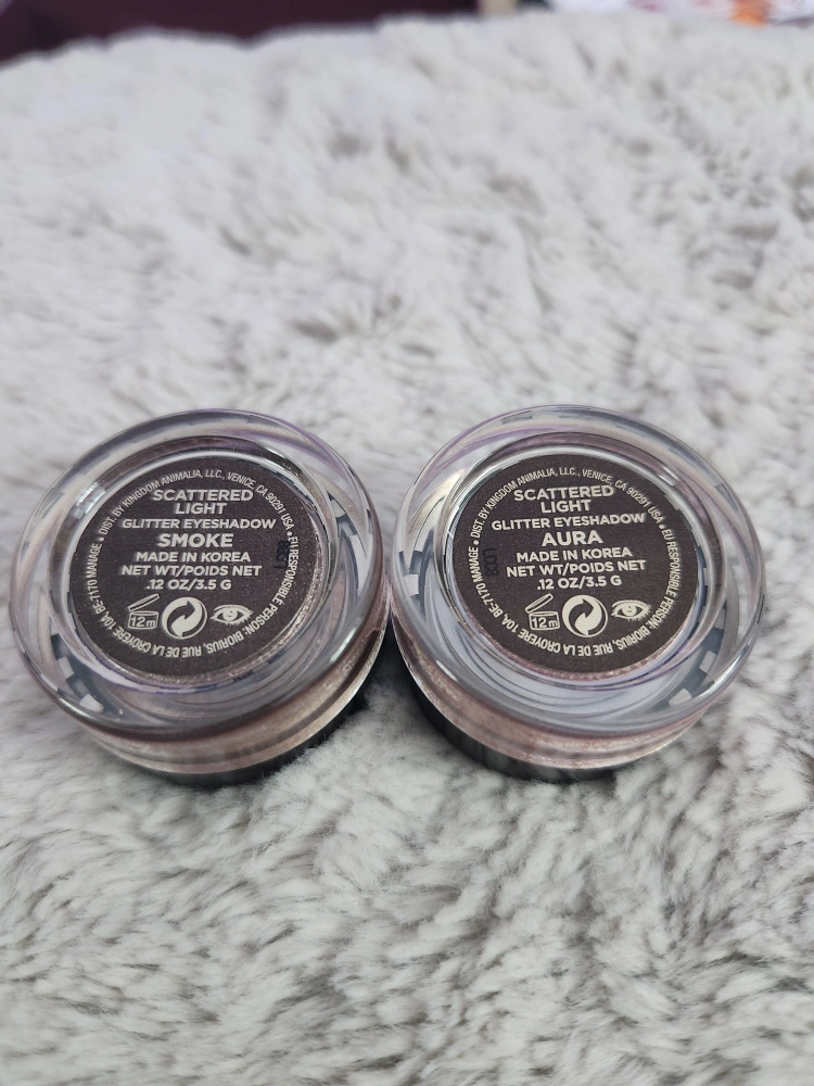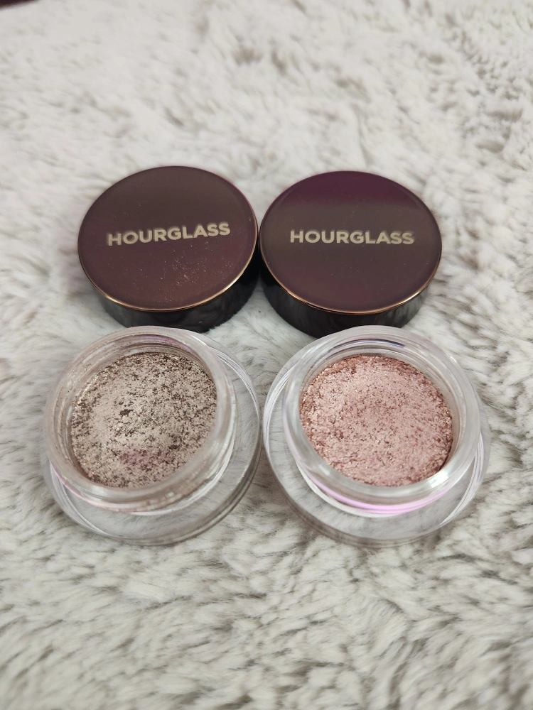Two Hourglass Scattered Light glitter eyeshadows. Shades are Aura and Smoke.