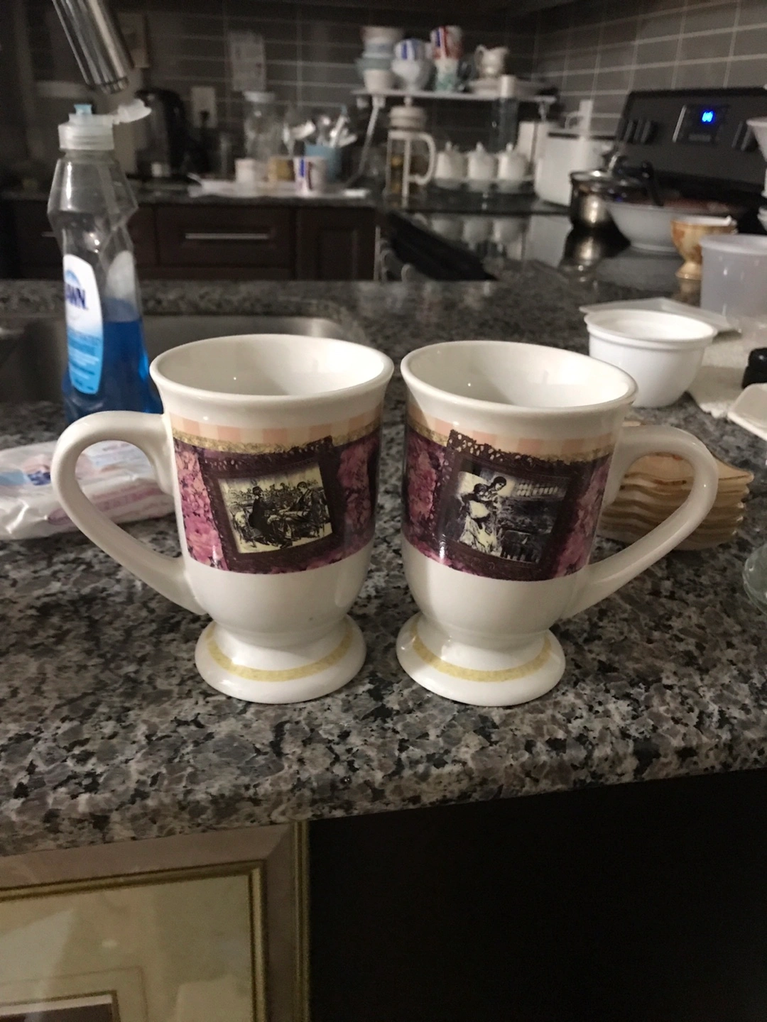 Two vintage coffee mugs. Feature a cream base with purple accents and sepia-toned images. Elegant design. Perfect for coffee or tea.