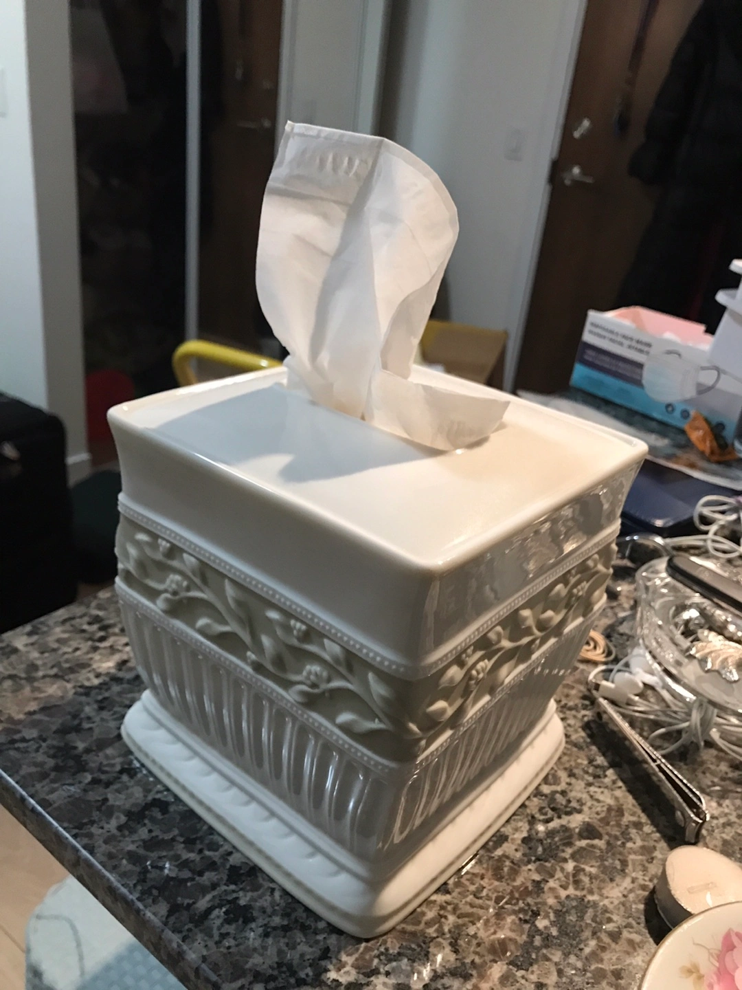 Square tissue box cover. Off-white ceramic with embossed floral detailing. Adds a touch of class to any room.