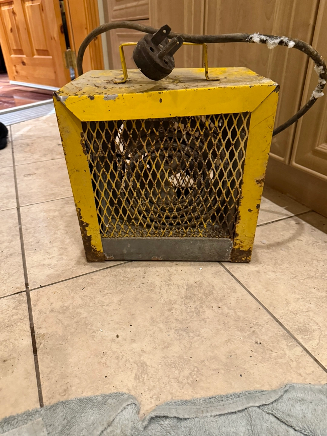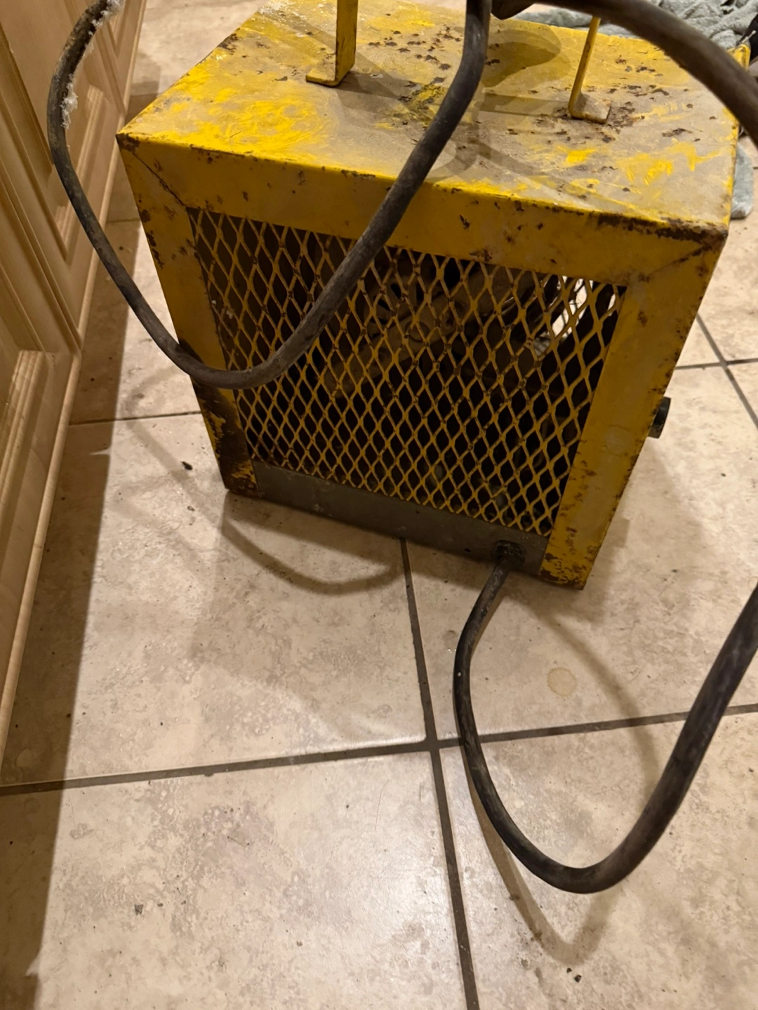 Old industrial heater. Yellow metal casing. Heavy-duty construction. Shows significant wear and tear. For industrial use only. 240V, 60 cycle, 4800 watts.
