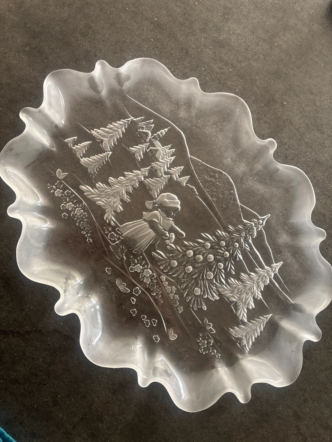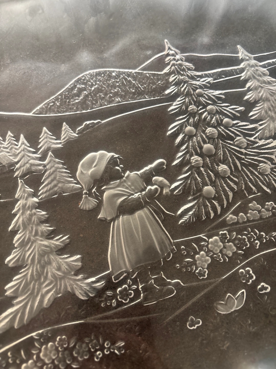 272Beautiful etched glass serving platter. Features a charming Christmas scene. Oval shape with scalloped edges. Perfect for holiday entertaining.