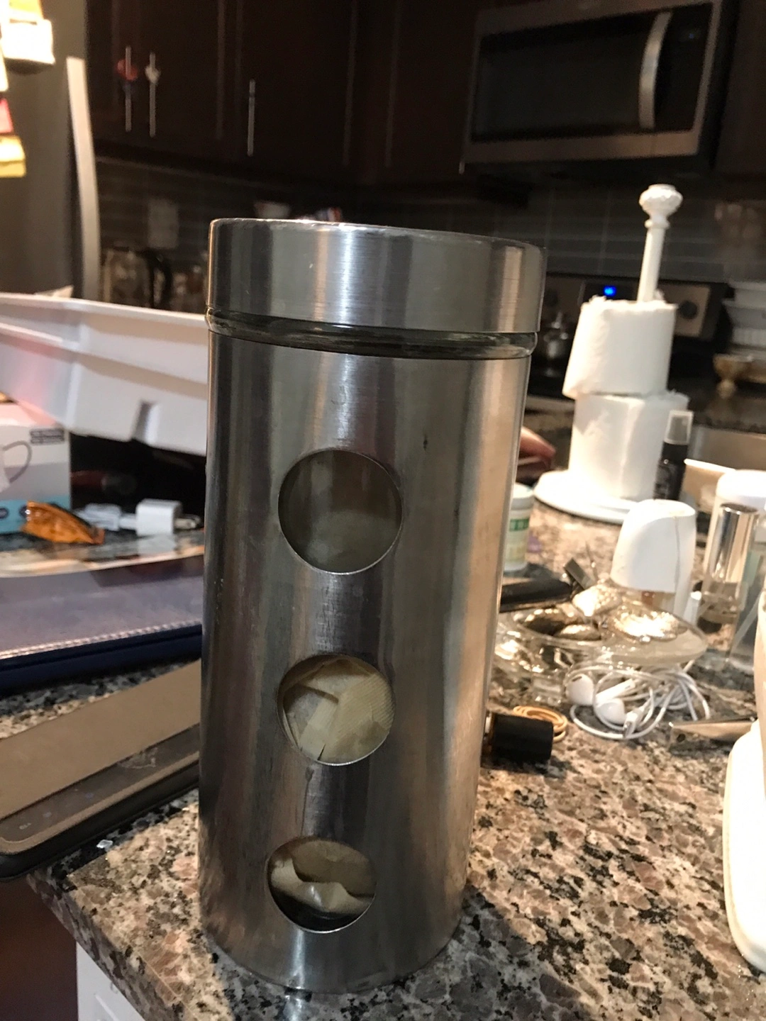 Cylindrical canister, stainless steel exterior, glass interior sections. Lid included. Perfect for storing tea bags or other small items.