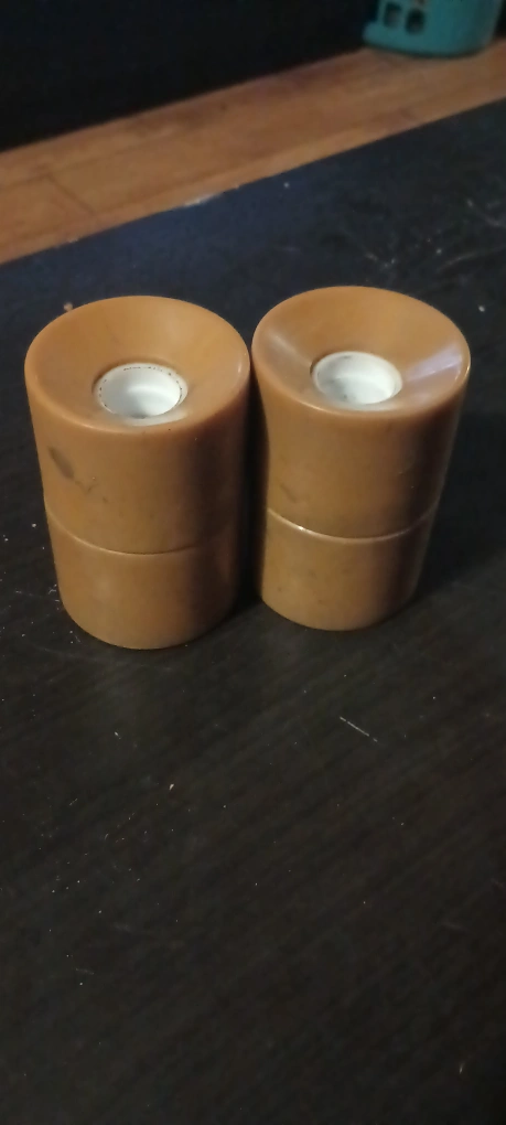 Two brown skateboard wheels. Used condition. Appear to be made of plastic or a similar material. Sold as a pair.