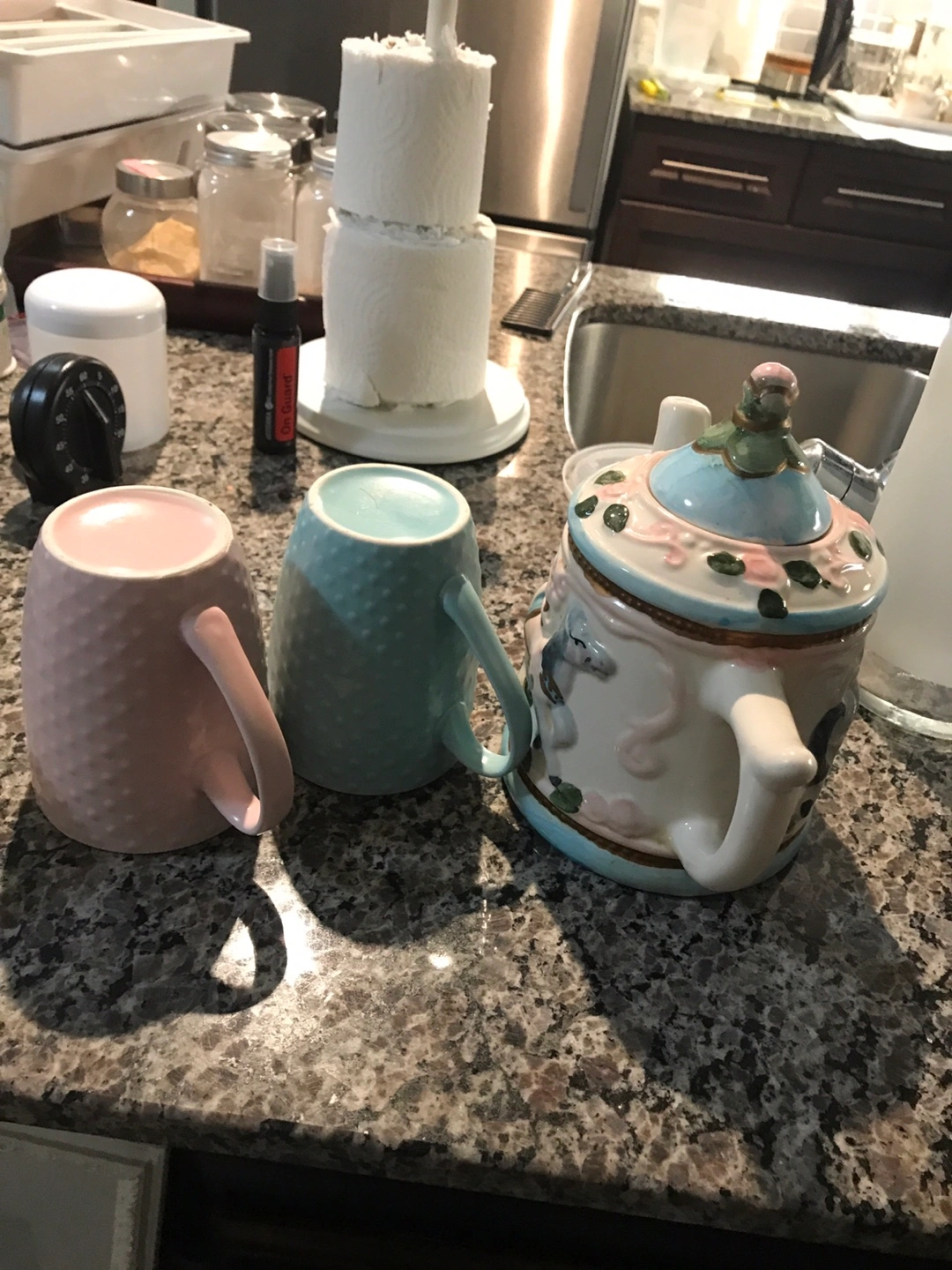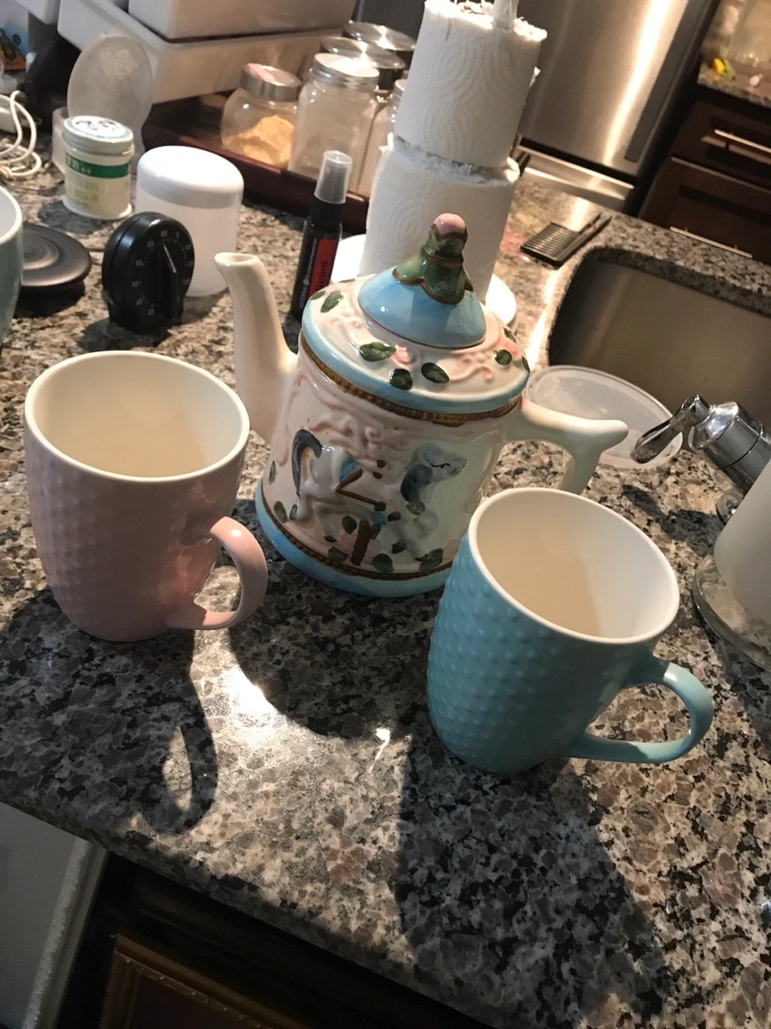 Charming teapot with carousel design. Two coordinating mugs, pastel pink and blue. Textured surface. Perfect for afternoon tea.