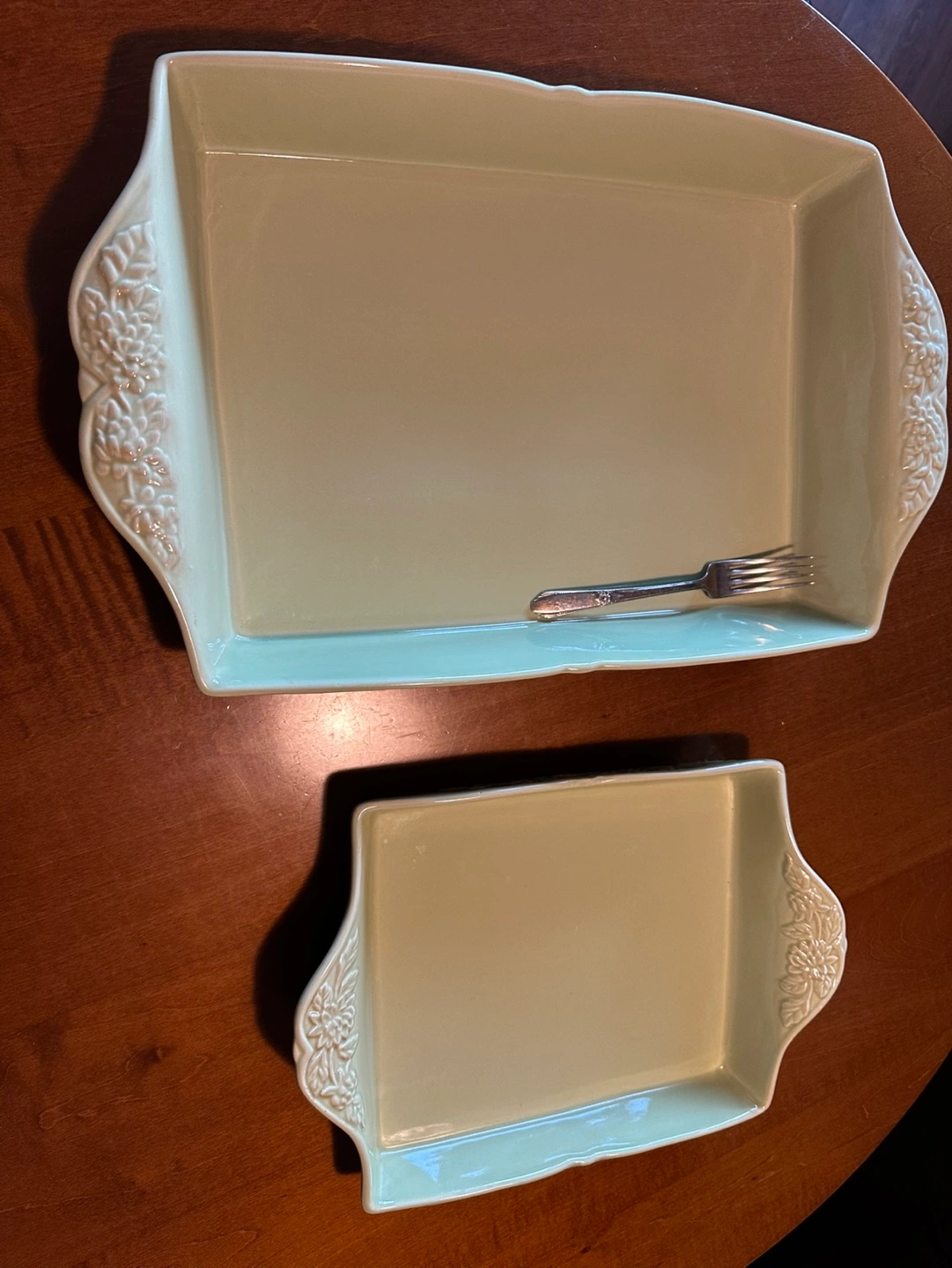Buy & SellSet of 2 Vintage Pale Green Ceramic Baking DishesSet of 2 Vintage Pale Green Ceramic Baking Dishes$20Two pale green ceramic baking dishes. Floral design on handles. Excellent for serving or baking.WHERE TO MEETKipling stationView MapSELLERBessCity Centre W343 reviews0 chats·0 favorites·15 viewsSEND CHAT TO SELLERHi Bess! I’m interested in your listing.Hi Bess! I’m interested in your listing.Get the Karrot app to chatSign In to chat