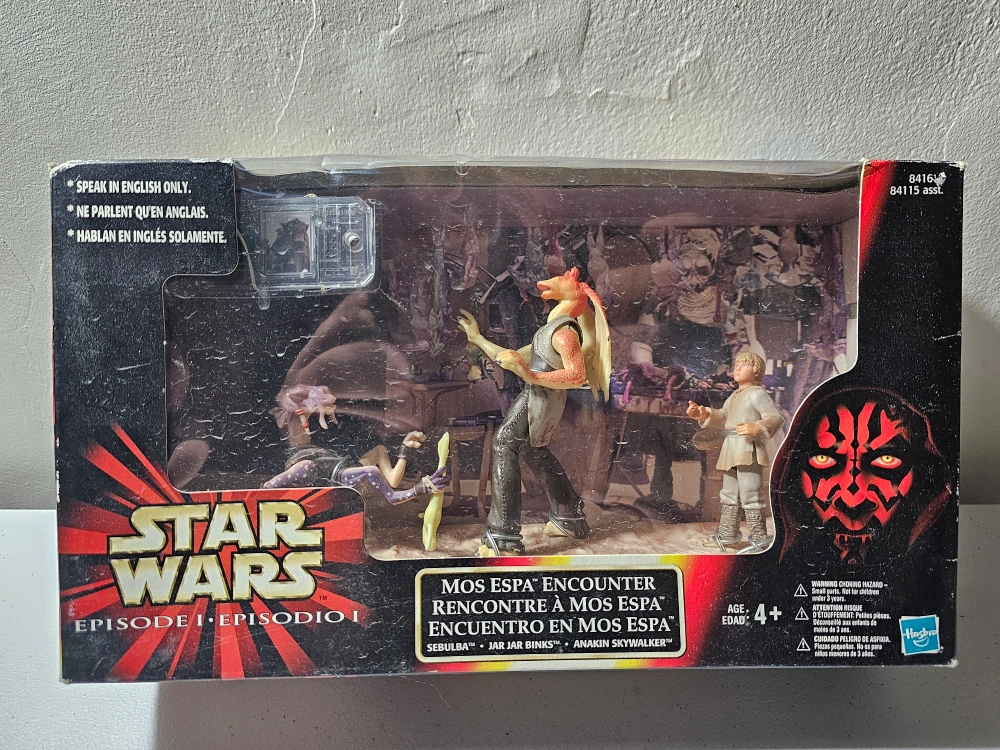 Vintage Star Wars Episode I Mos Espa Encounter playset. Includes figures of Sebulba, Jar Jar Binks, and Anakin Skywalker. Electronic features; box shows some wear.