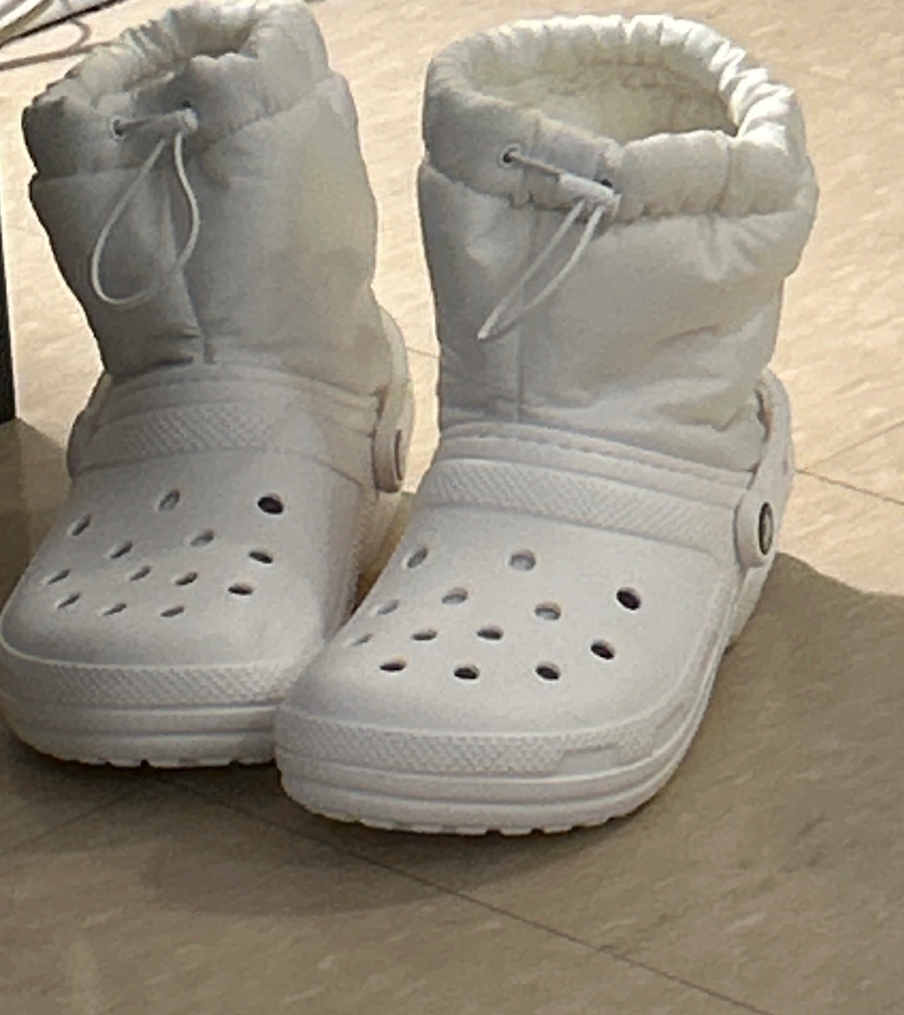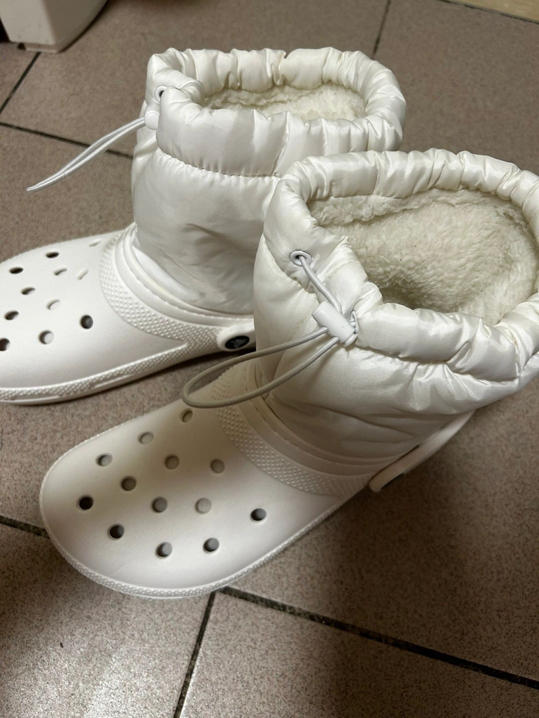 Women's white Crocs boots. Features a cozy fleece lining and a puffer-style upper. Drawstring closure. Great for winter weather. New without tags Made in Vietnam