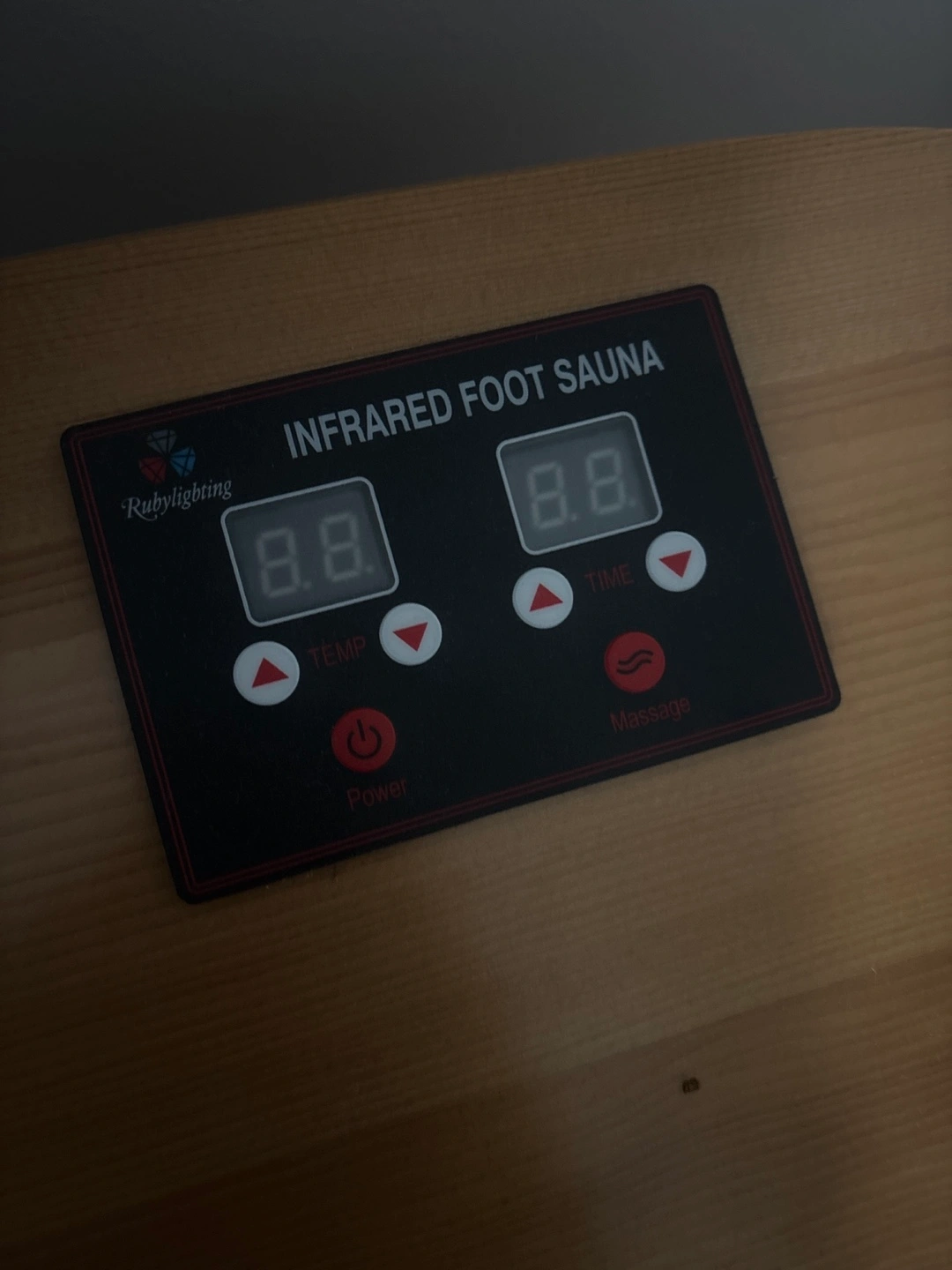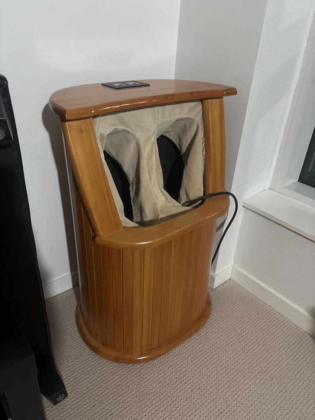 272Used infrared foot sauna. Wooden construction. Features temperature and timer controls. Includes massage function. Good condition.