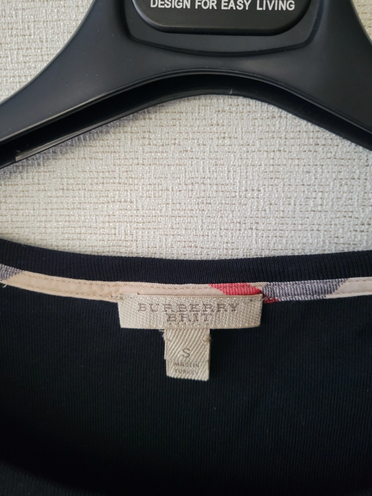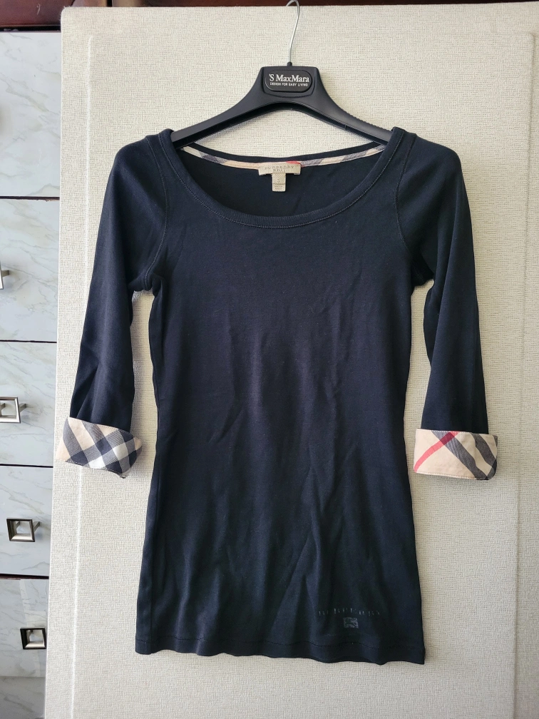 Black 3/4 sleeve top. Features iconic Burberry check detailing on the cuffs. Size small. Soft cotton material. Excellent condition.