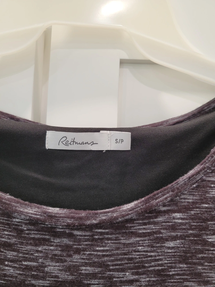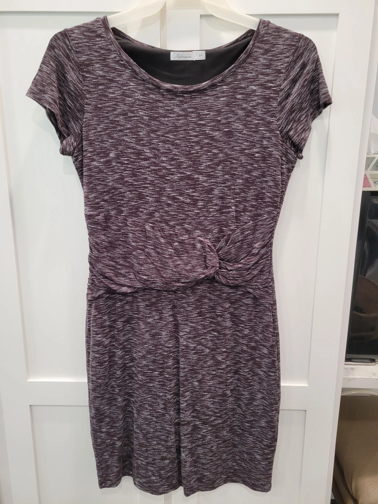 18Adorable dark purple and grey heather knit dress. Short sleeves. Front knot detail. Size small/petite.$10 East Regina