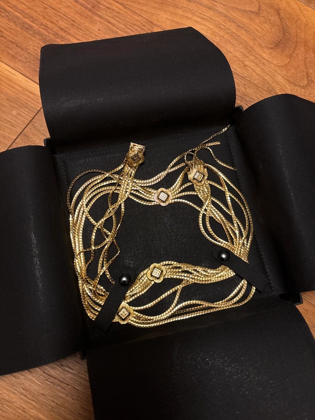 272Gorgeous gold-tone necklace. Features multiple strands of chain. Unique clasp design. Comes in original box. It could be necklace or belt Unique!