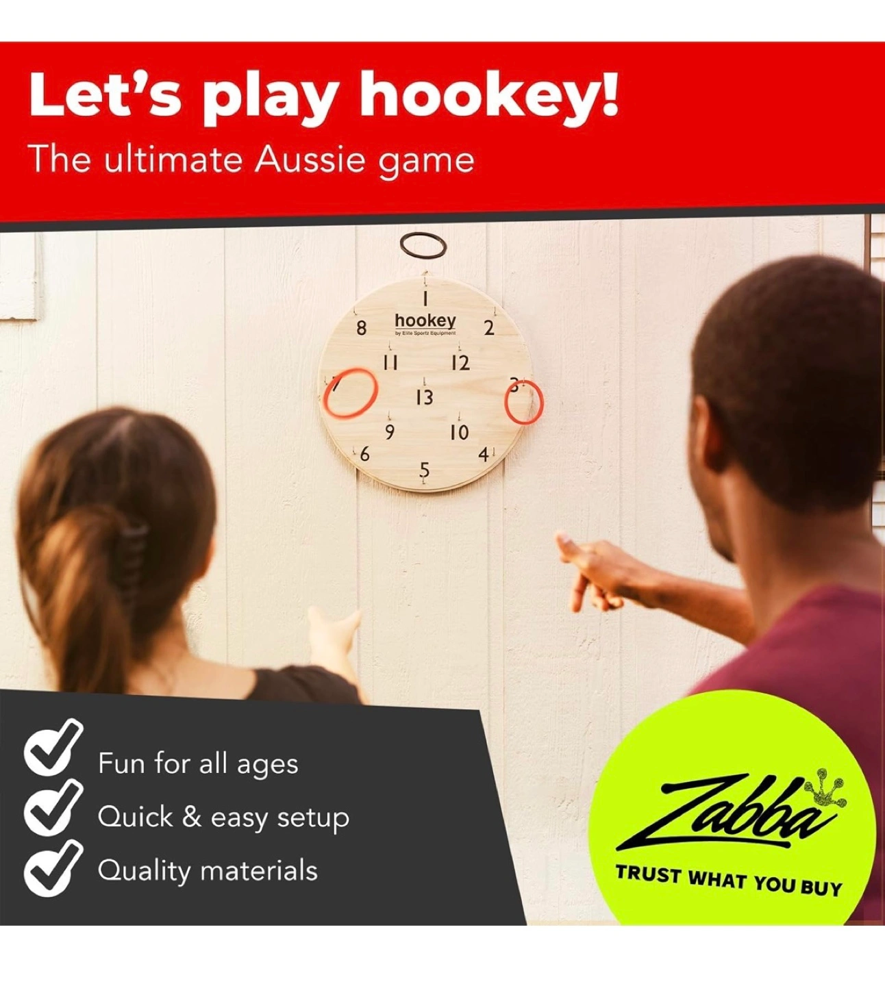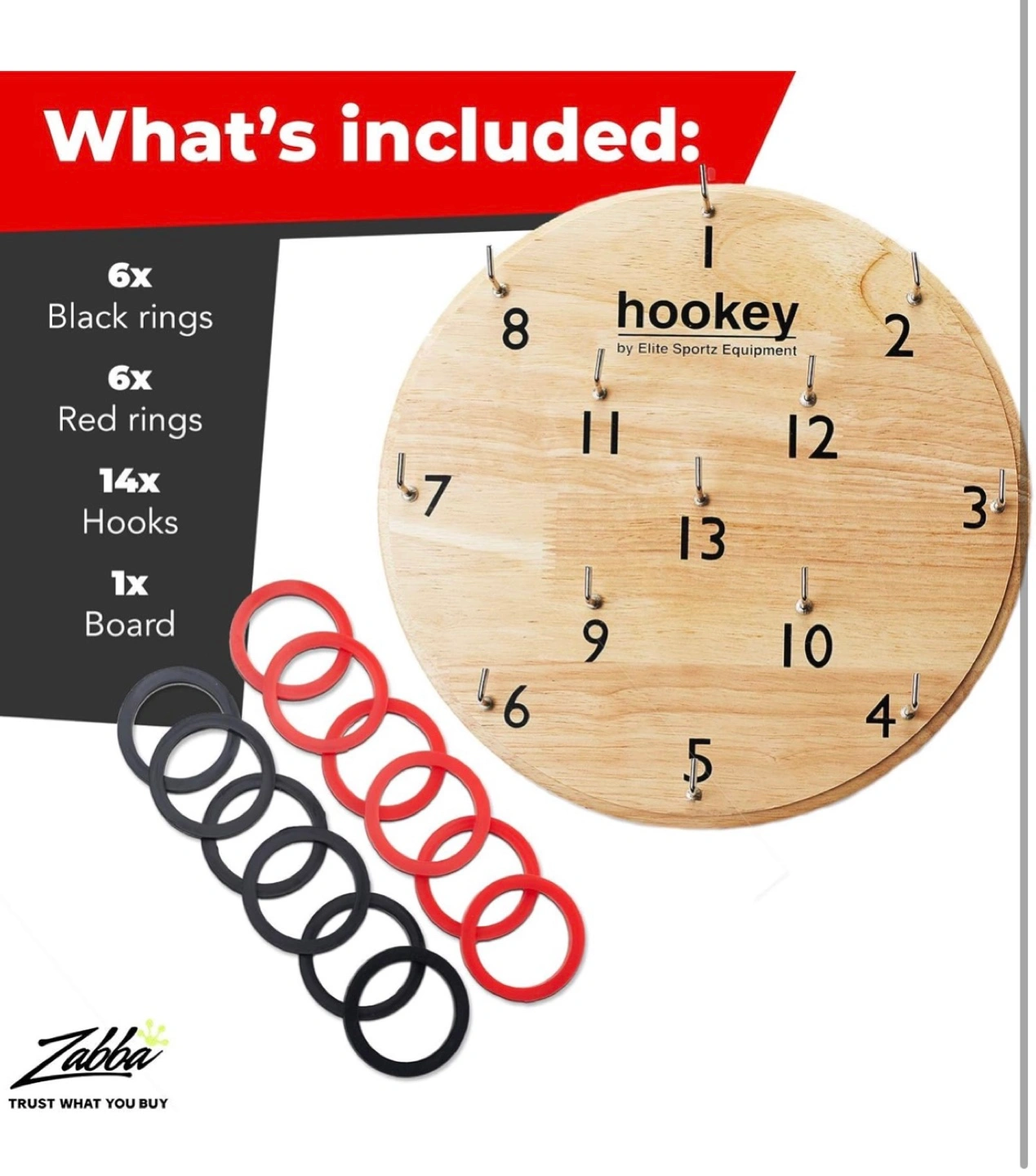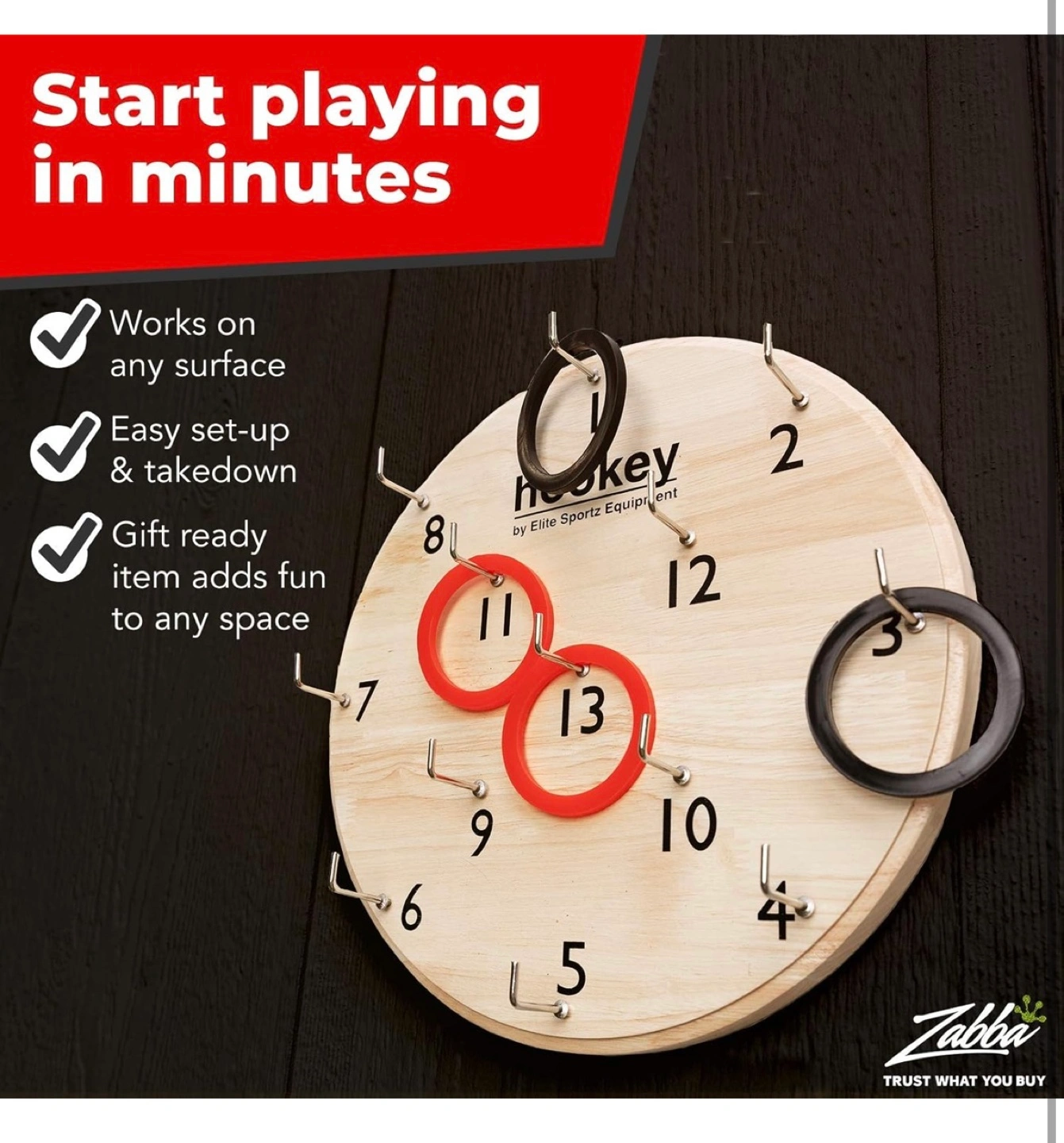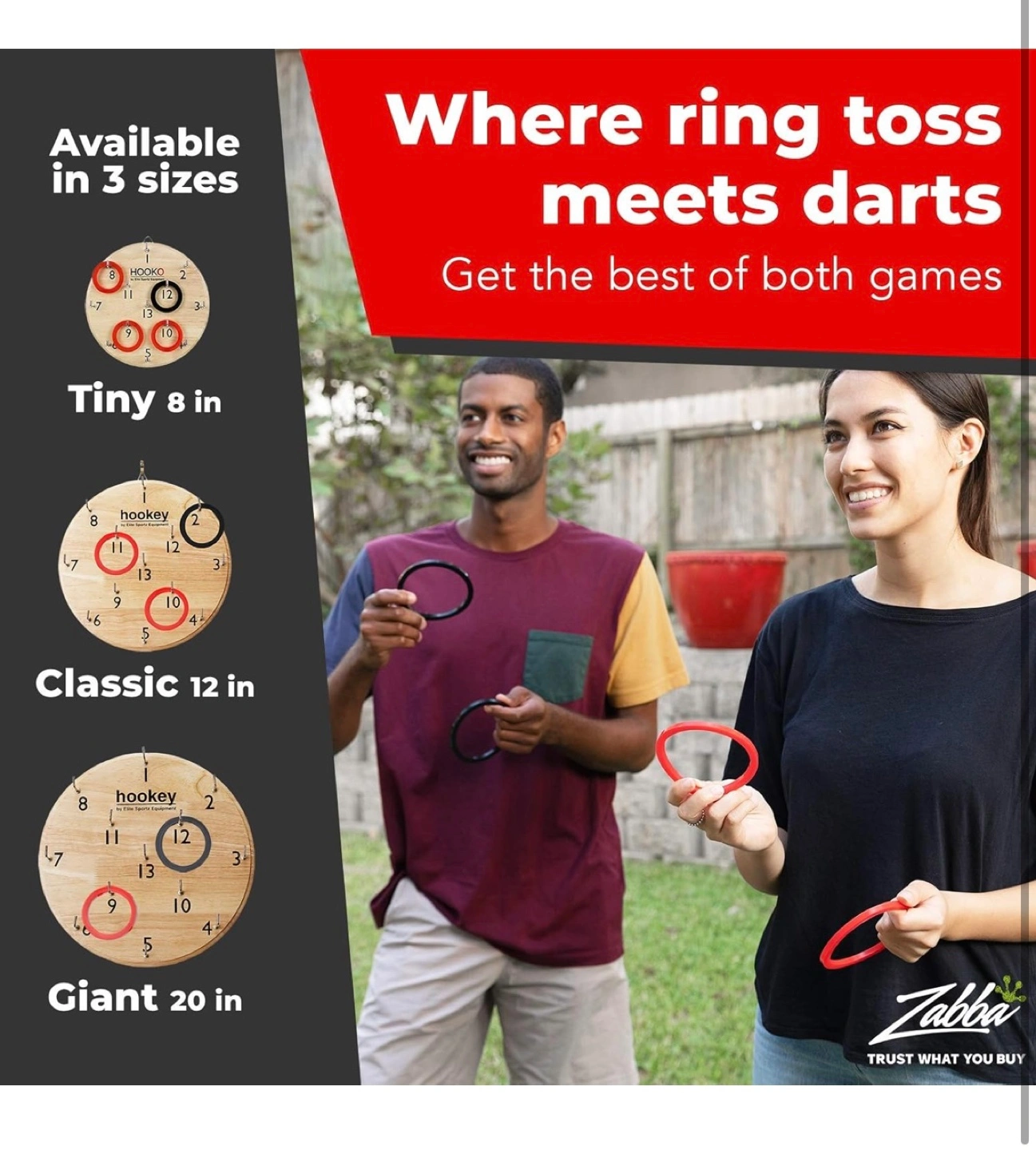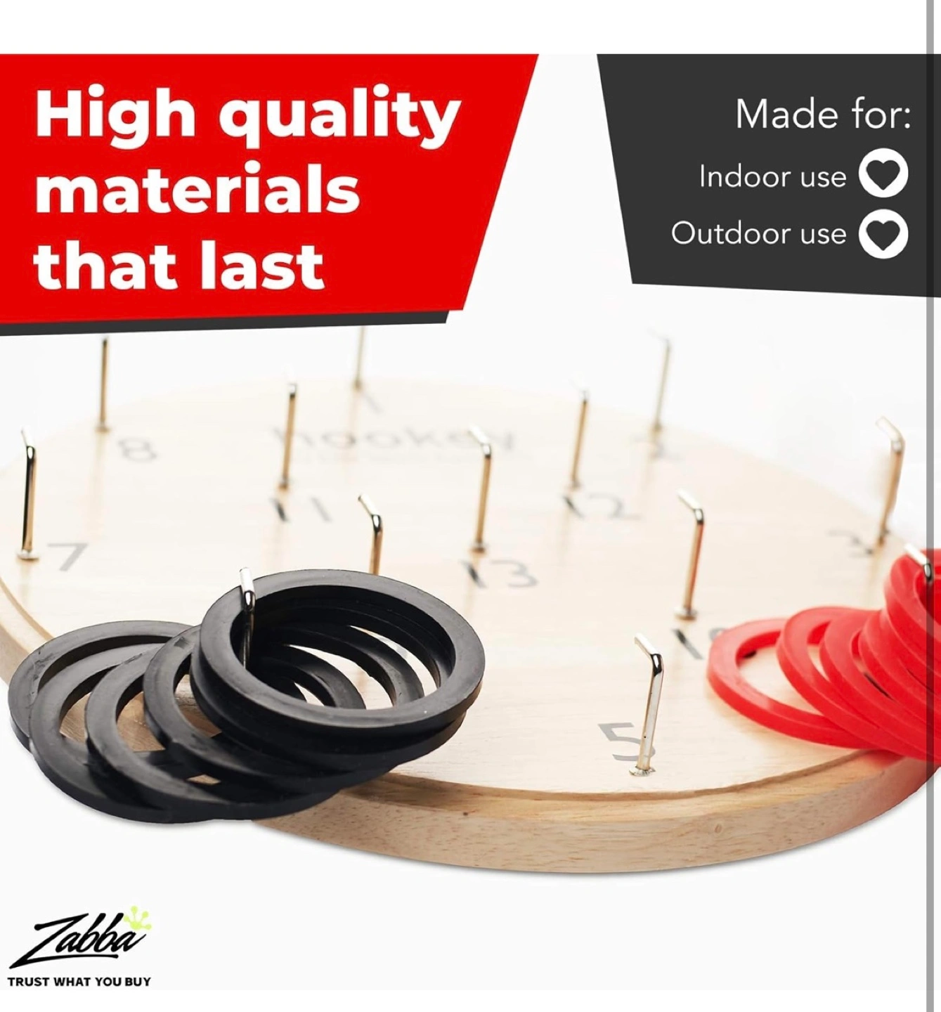 Fun outdoor game. Includes wooden board, six red rings, six black rings, and mounting hardware. Three sizes available. Easy setup. Durable design. Quality materials. Fun for all ages.