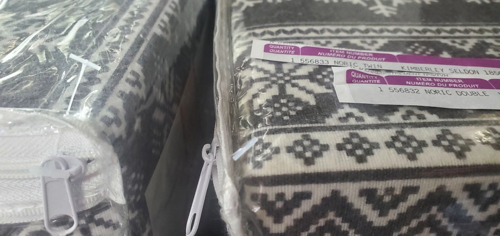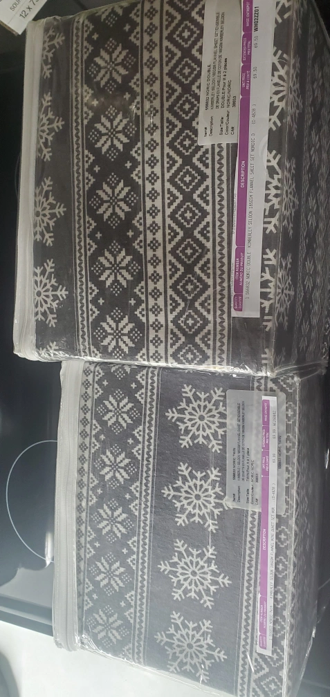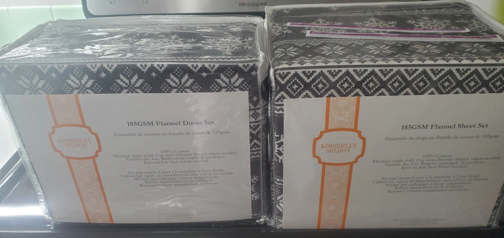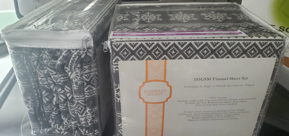 Two brand new Kimberley Seldon flannel sheet sets. One is a double set.. flat ,fitted and two pillowcases and the other is a single duvet and one pillowcase .. this size duvet covers a double bed perfectly without hanging over the edge 185GSM. Grey and white snowflake pattern. 100% cotton. Machine washable. Paid $145.00 plus shipping