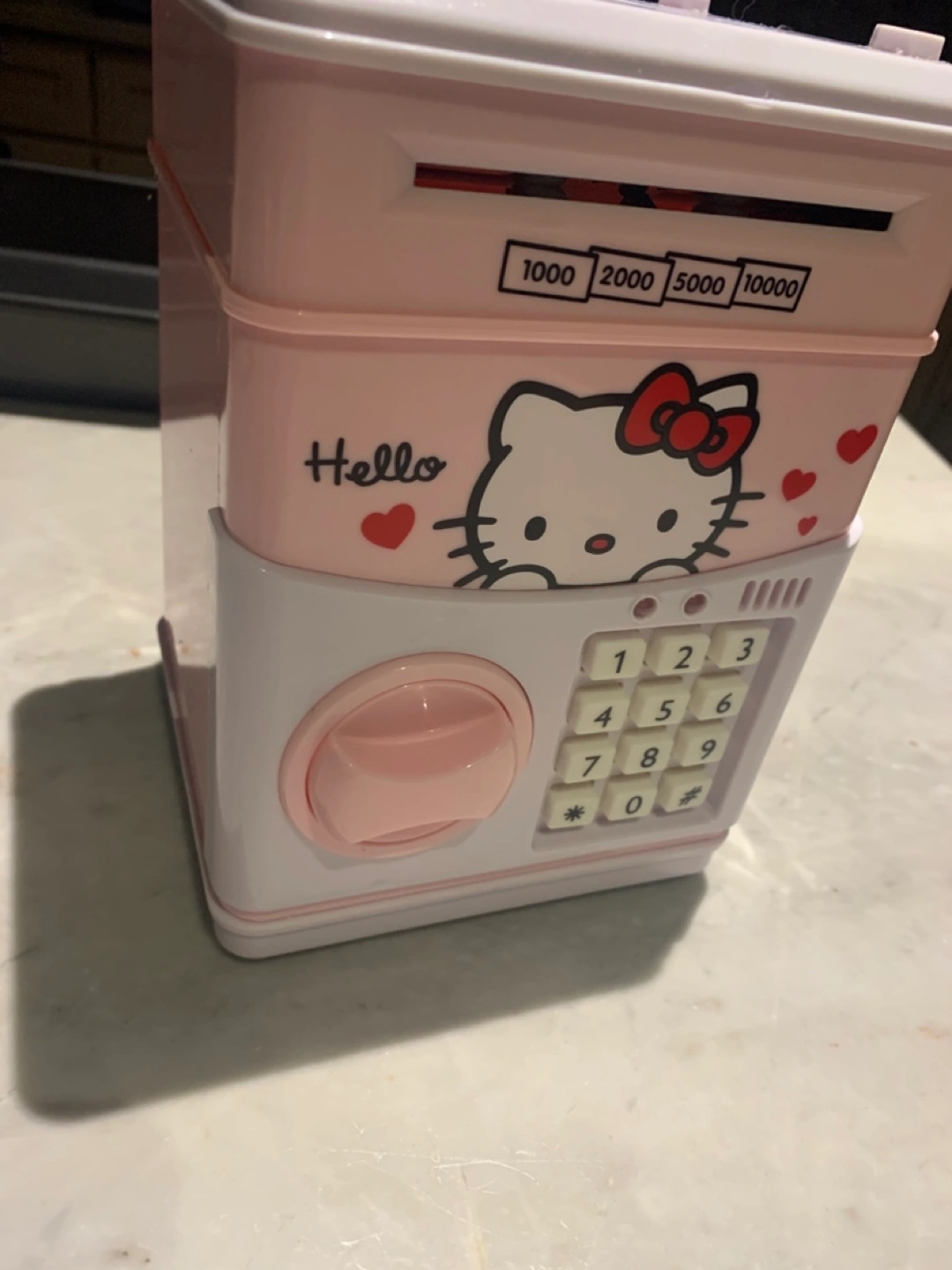Selling a Hello Kitty-themed electronic piggy bank with fun sound effects and secure password protection!