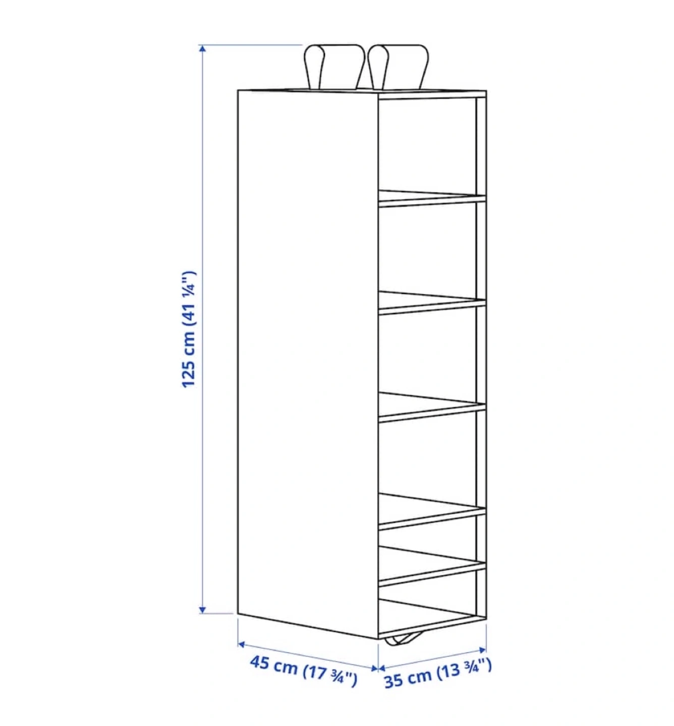 White fabric hanging organiser. Five shelves. Great for closets or drawers. Foldable for easy storage.
