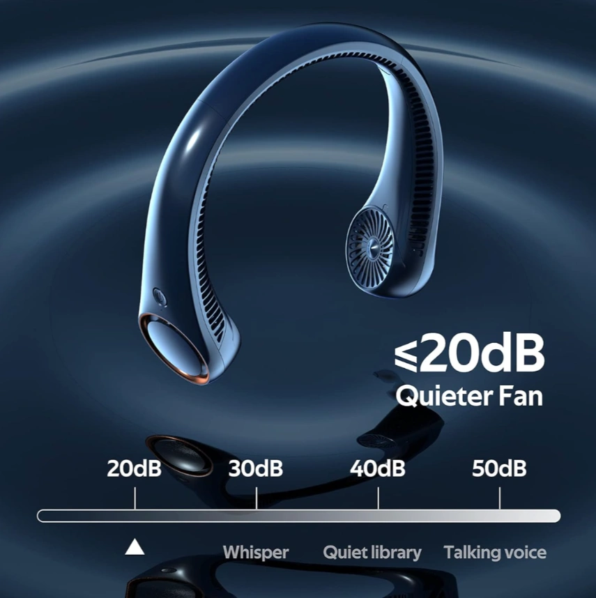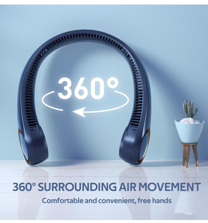 Wearable neck fan. 360° air movement. Quiet operation. Multiple colours available. Comfortable and convenient.