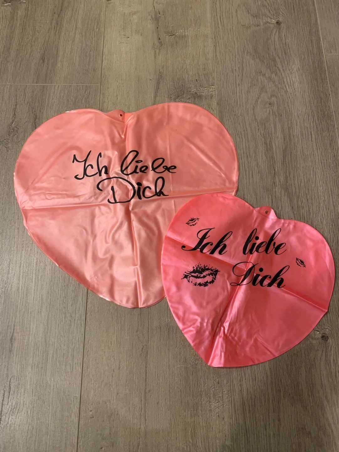 Set of two pink heart-shaped inflatable. Features German phrase: Ich Liebe Dich. I love you! Perfect for Valentine's Day or romantic occasions. One balloon has a small lip print design.
