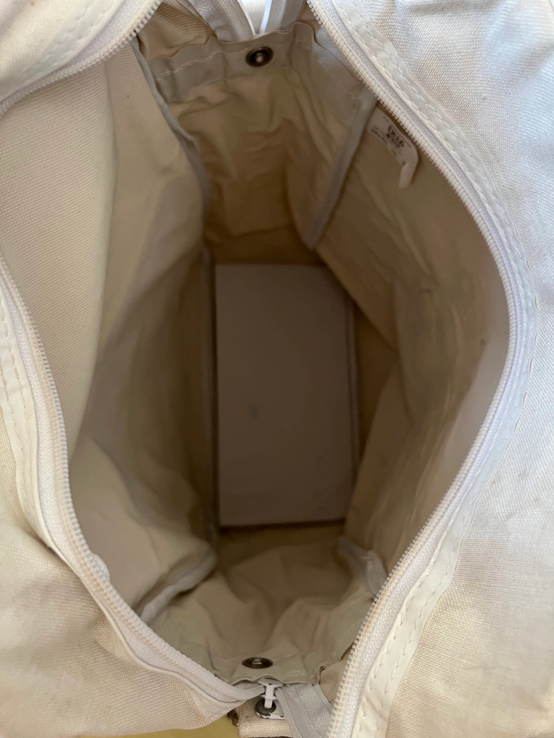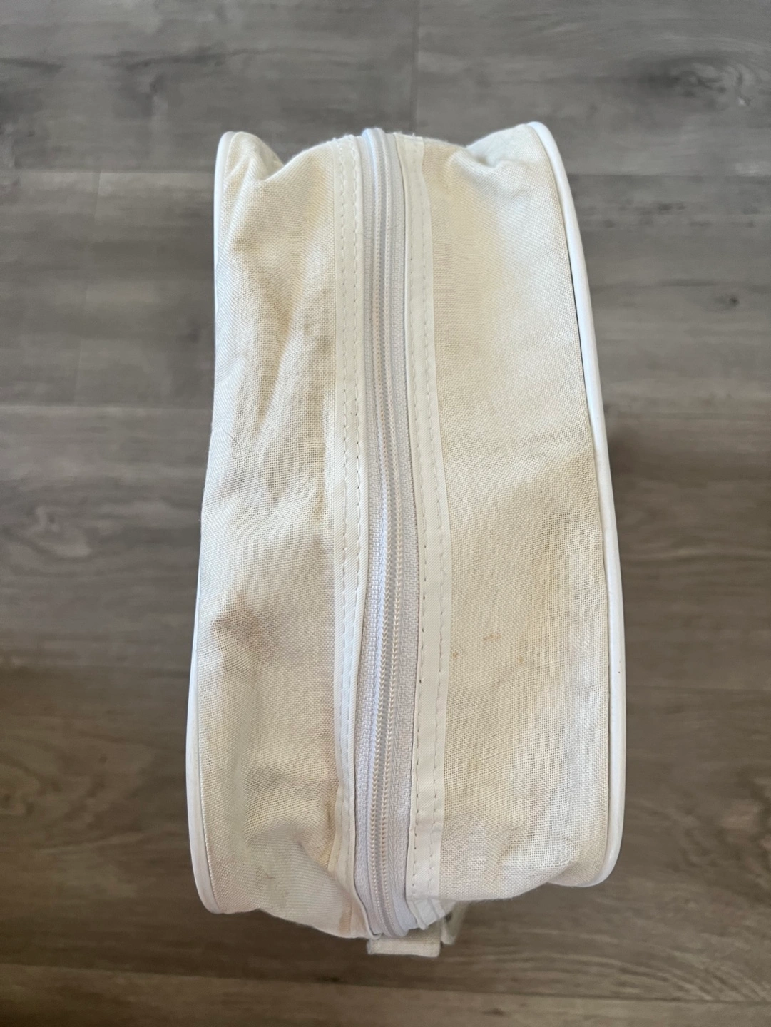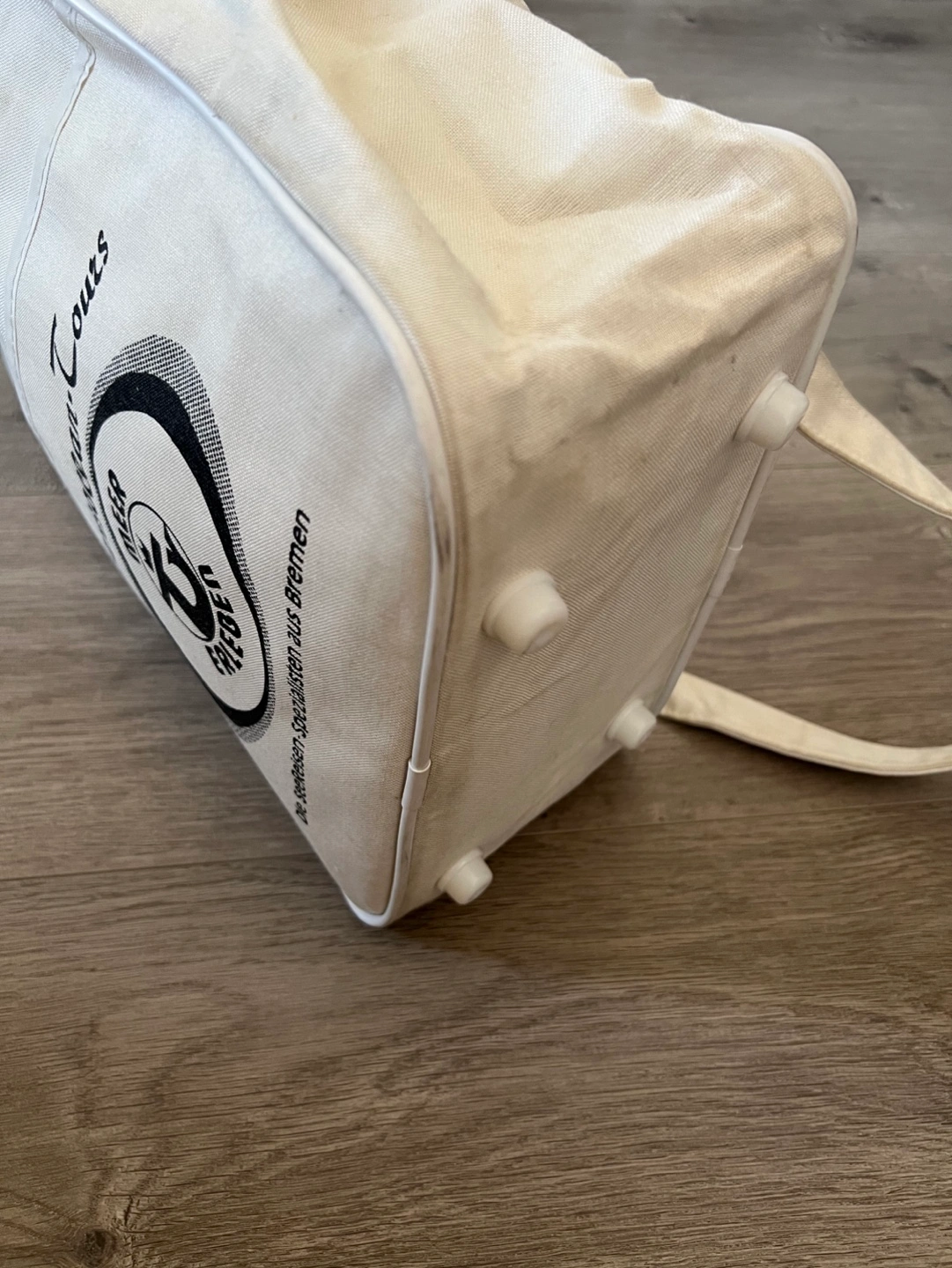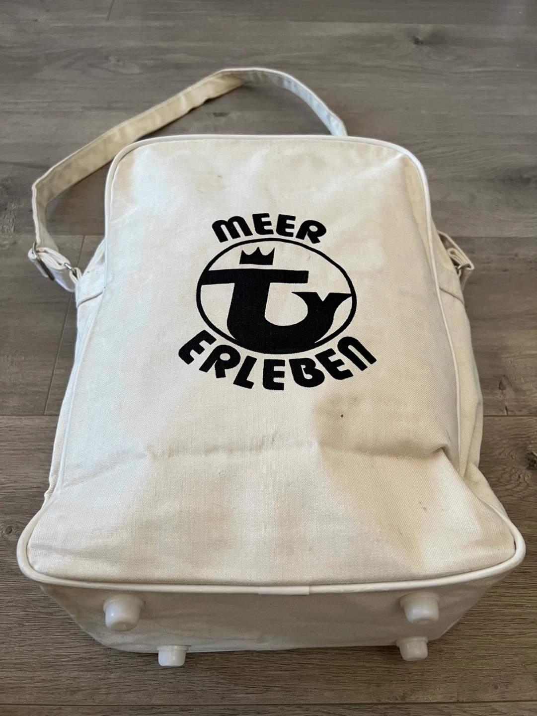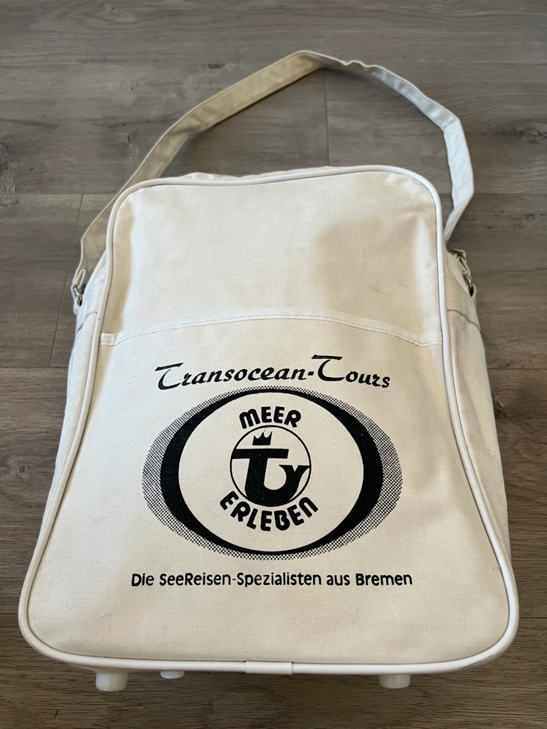 Vintage Off-white canvas shoulder bag. Features a logo for Transocean Tours. Zipper closure. German phrase Meer erleben!