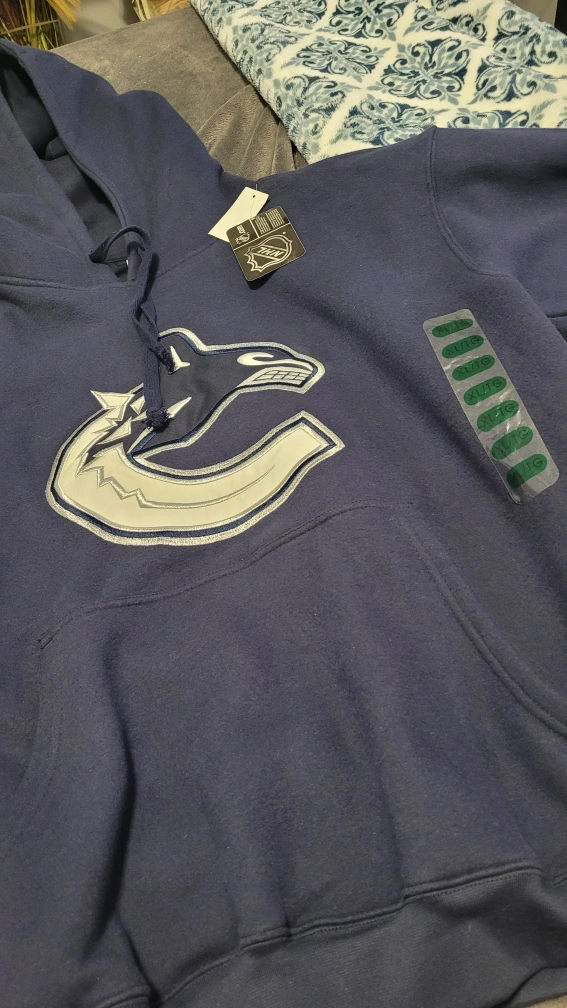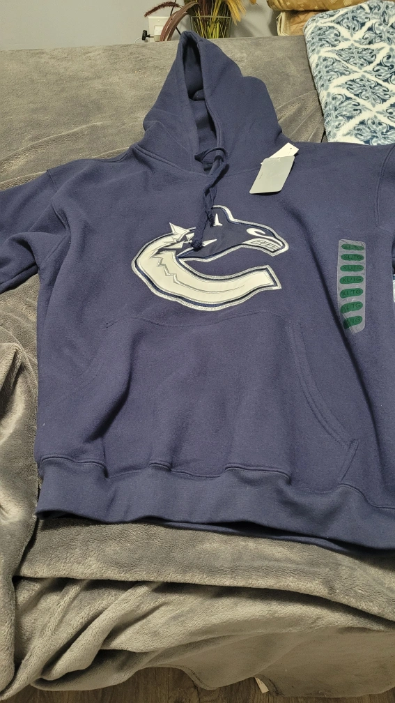 Navy blue Canucks hoodie. Features team logo on the front. New with tags. SIZE XL. PAID 90 PLUS TAX. NEED GONE ASAP. THANK YOU
