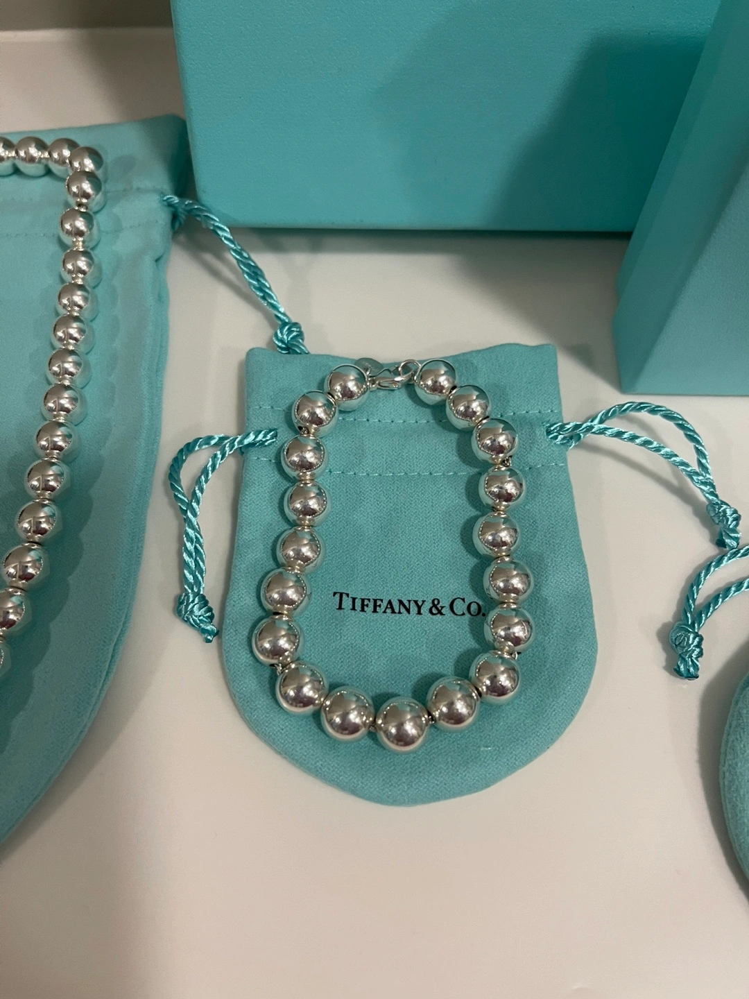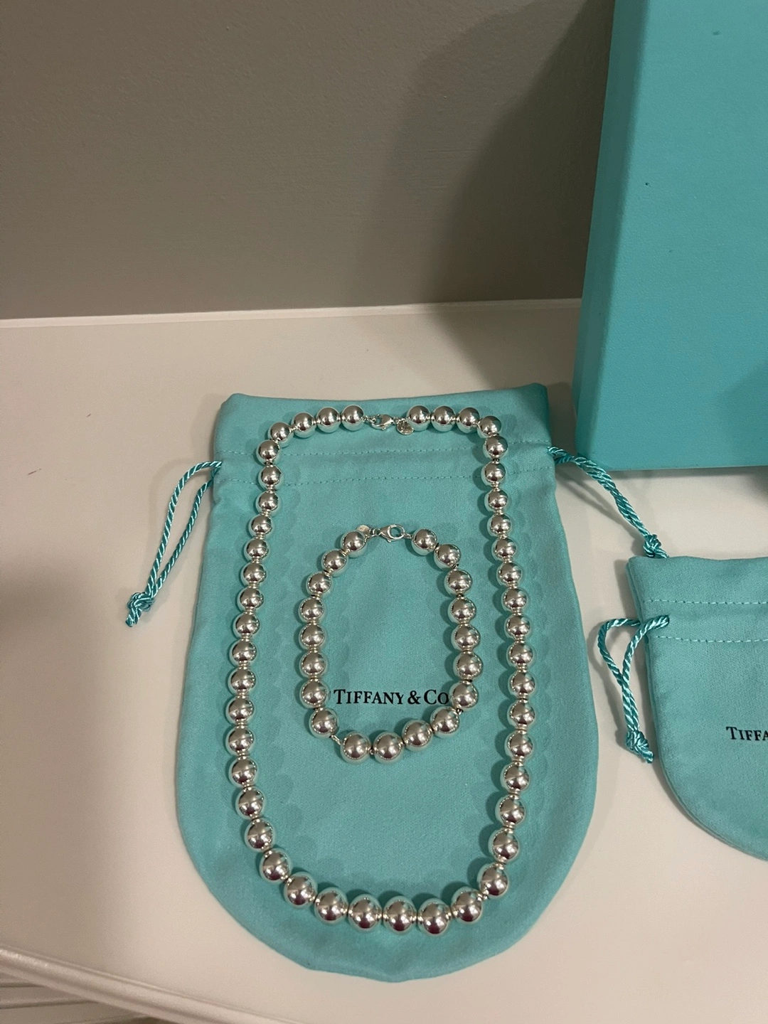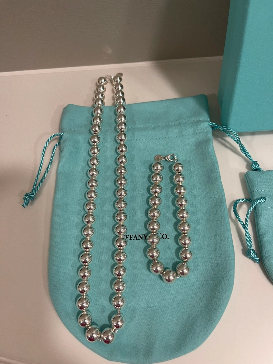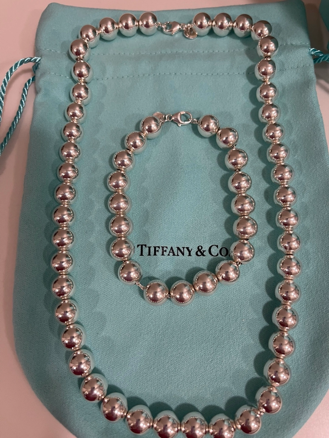 Luxurious TIFFANY SILVER NECKLACE and BRACELET. Picked up recently from Tiffany store after both pieces were cleaned. NECKLACE - NEVER WORN - Sterling Silver 905 - is 17.5” - 10 mm ball chain - selling at Tiffany store for 1250.00 + tax 62.50 = 1312.50 BRACELET - WORN 2-3 times - Sterling Silver 905 - is 7.5” - 10 mm ball chain - selling at Tiffany store for 905.00 + tax 45.25 = 950.25 TOTAL PRICE AT TIFFANYS - 2265.75 (includes GST) Selling for 1800.00 with a gift of similar looking -BUT NOT TIFFANY- BALL EARRINGS - worn a few times. Will meet at store if you have any questions as this is a large purchase. WILL sell separately if desired- NECKLACE - 1050.00 BRACELET - 760.00