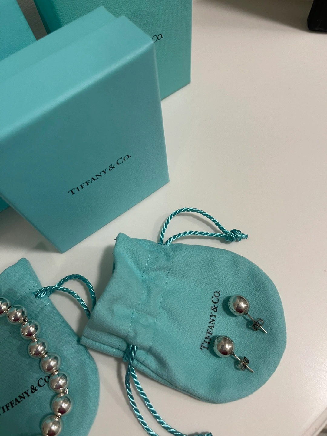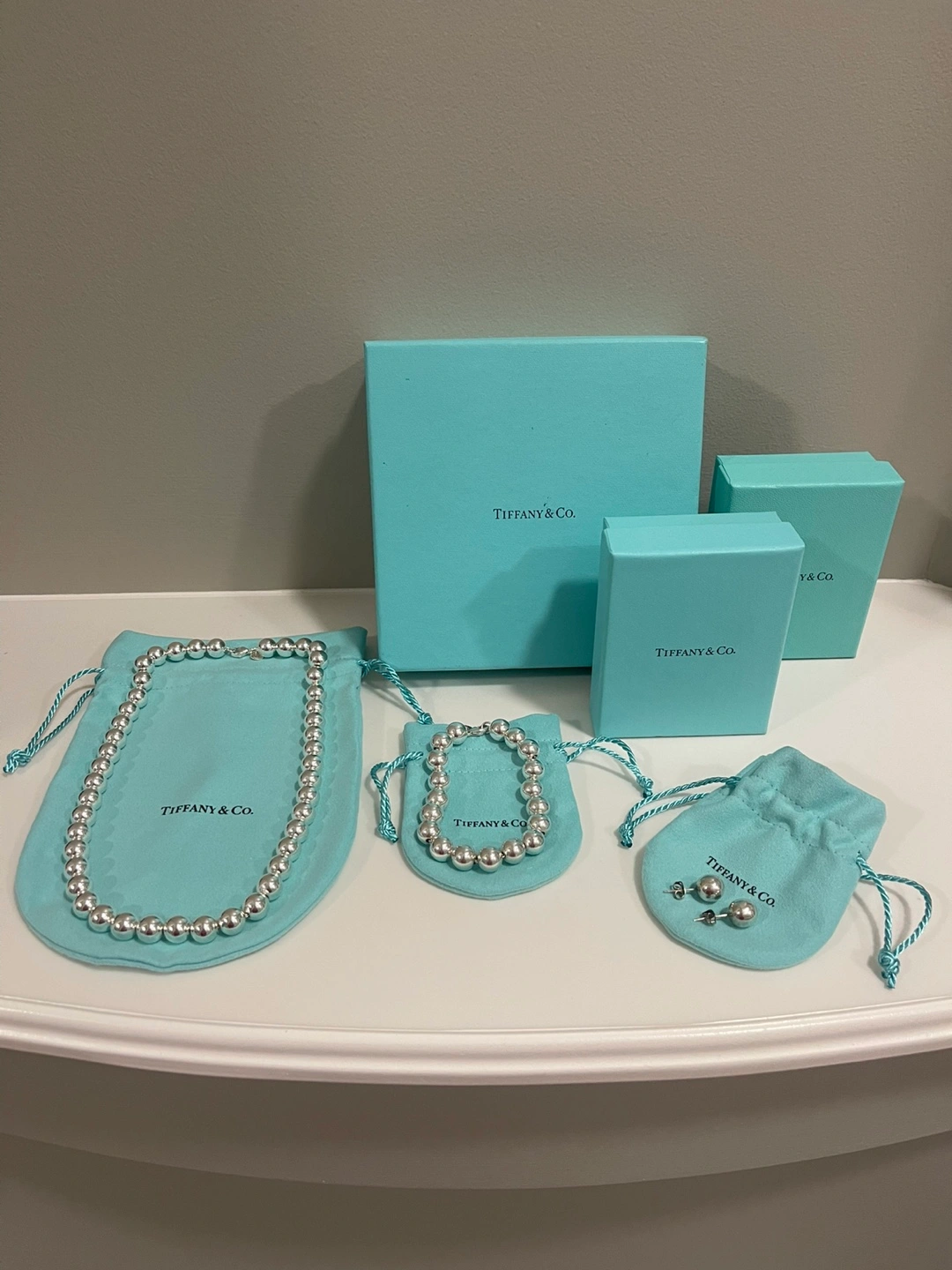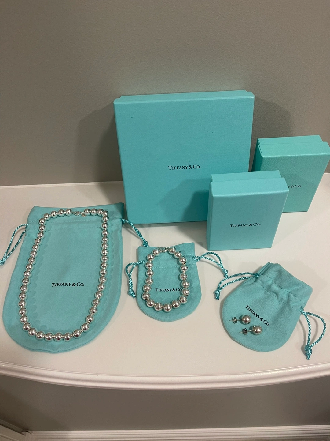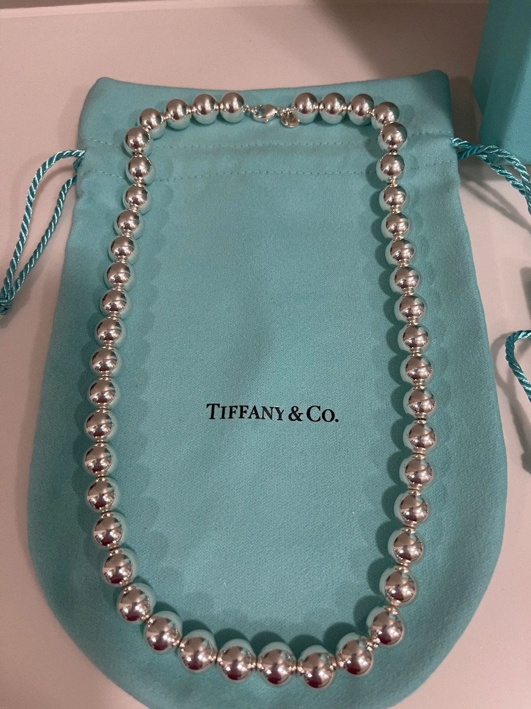 Luxurious TIFFANY SILVER NECKLACE and BRACELET. Picked up recently from Tiffany store after both pieces were cleaned. NECKLACE - NEVER WORN - Sterling Silver 905 - is 17.5” - 10 mm ball chain - selling at Tiffany store for 1250.00 + tax 62.50 = 1312.50 BRACELET - WORN 2-3 times - Sterling Silver 905 - is 7.5” - 10 mm ball chain - selling at Tiffany store for 905.00 + tax 45.25 = 950.25 TOTAL PRICE AT TIFFANYS - 2265.75 (includes GST) Selling for 1800.00 with a gift of similar looking -BUT NOT TIFFANY- BALL EARRINGS - worn a few times. Will meet at store if you have any questions as this is a large purchase. WILL sell separately if desired- NECKLACE - 1050.00 BRACELET - 760.00