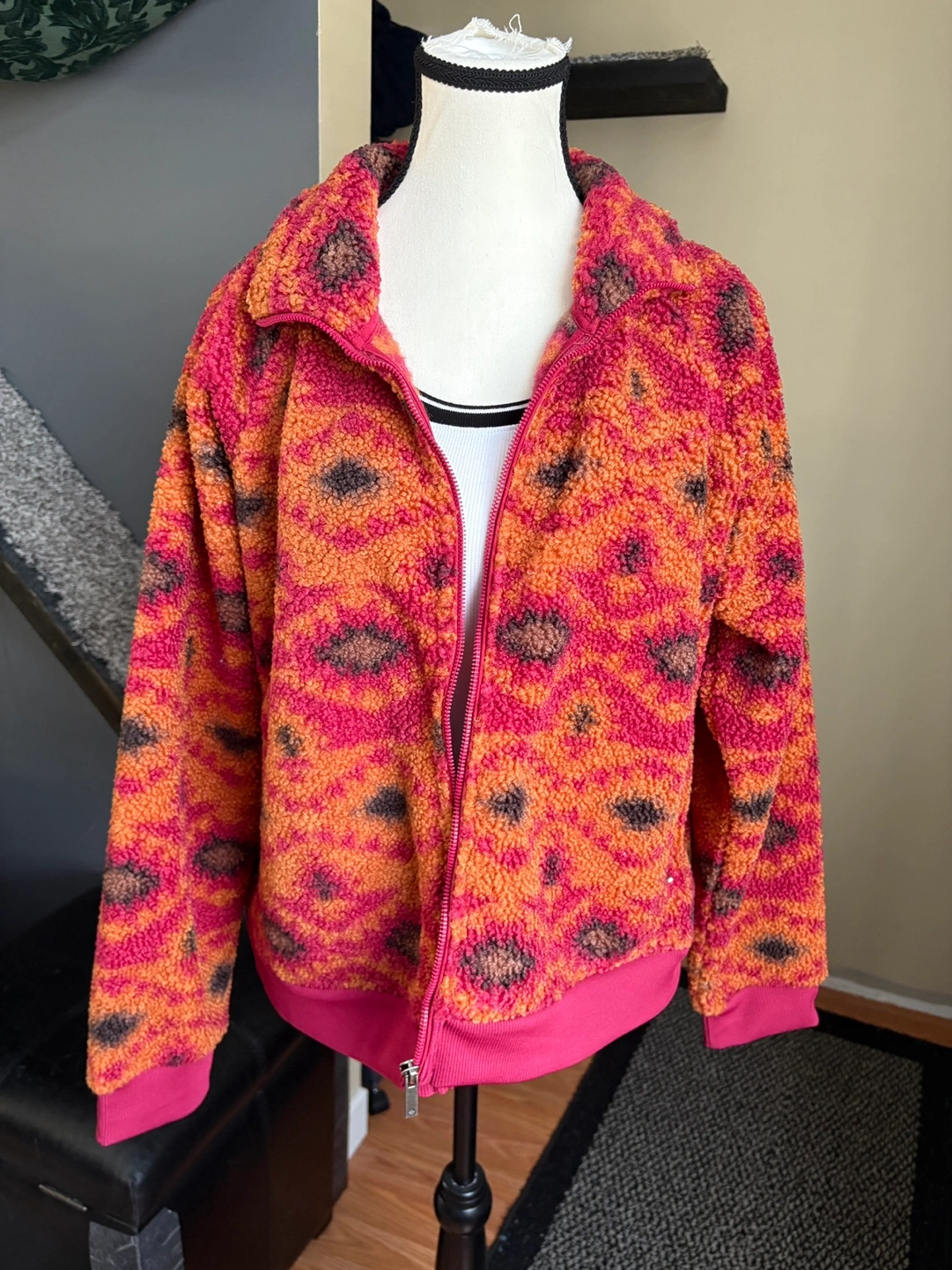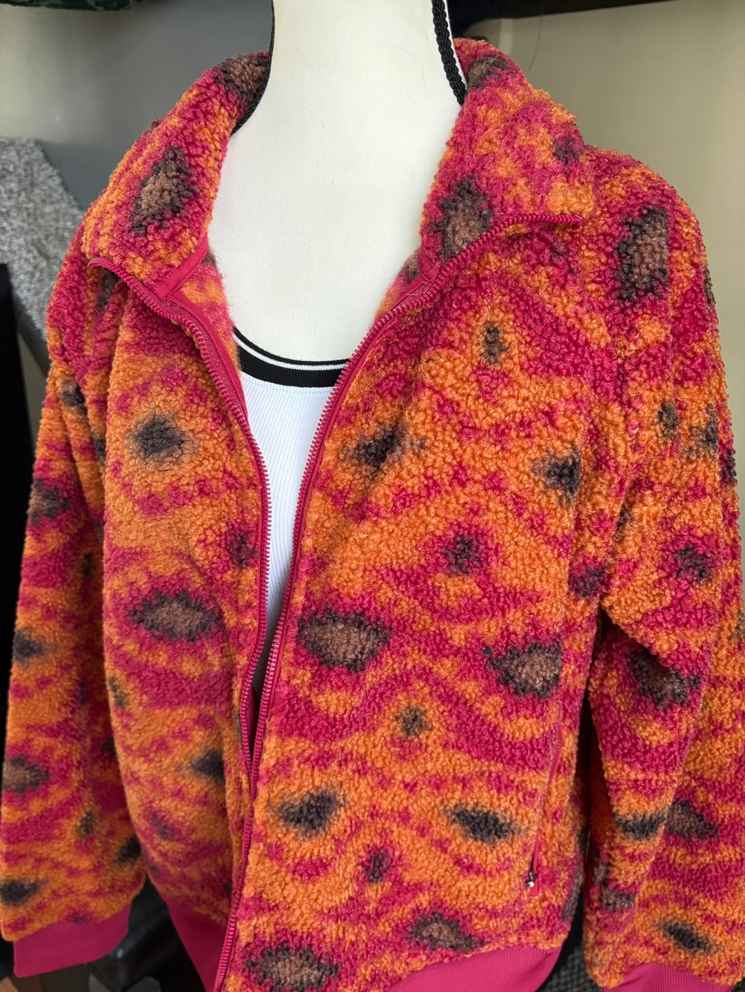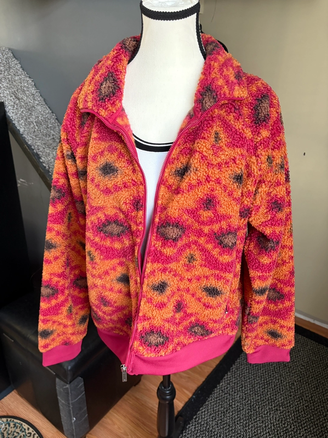 Cozy fleece jacket. Features a full zip closure and long sleeves. Animal print design in shades of pink, orange, and brown. Great for layering during colder months.