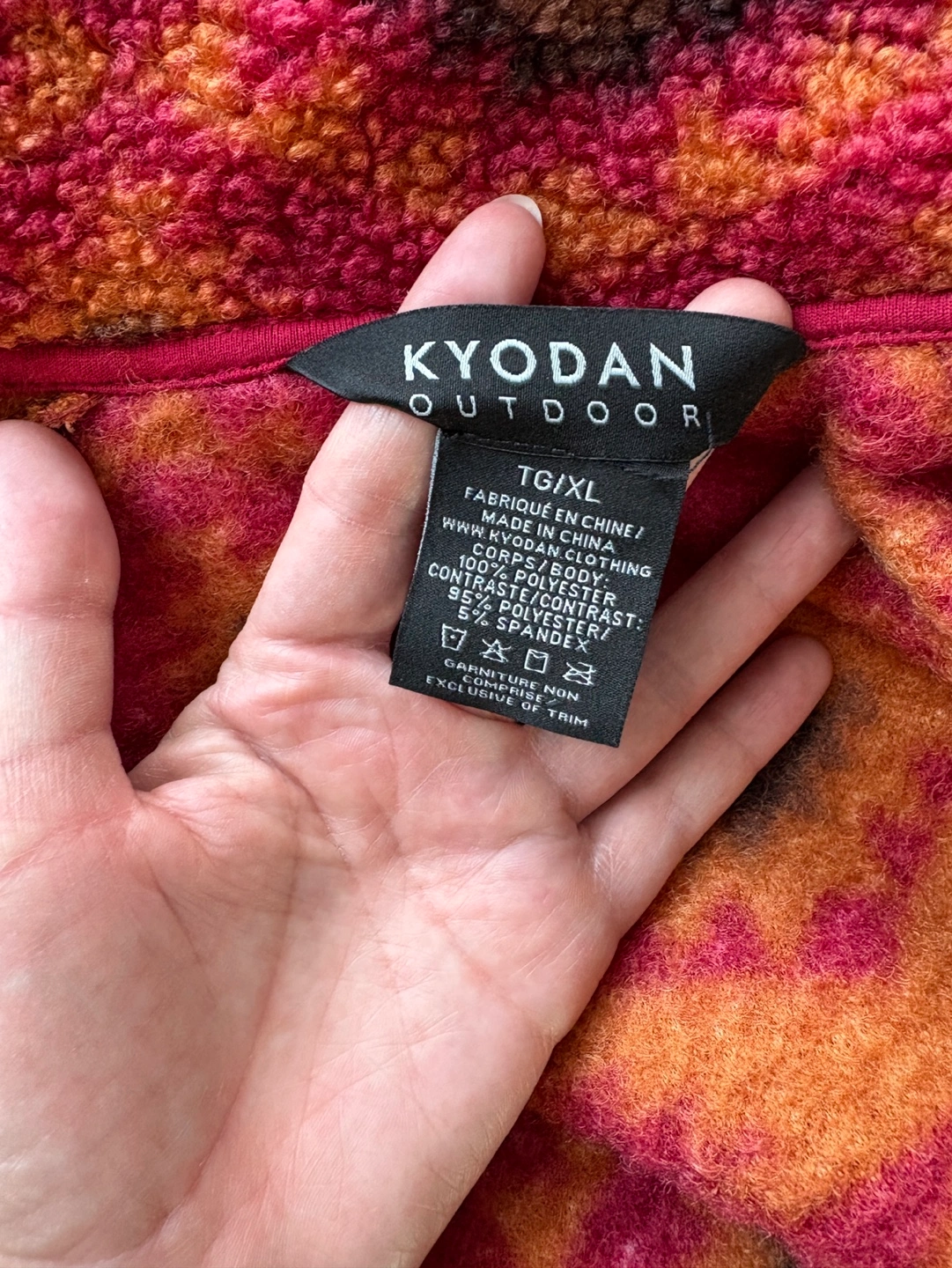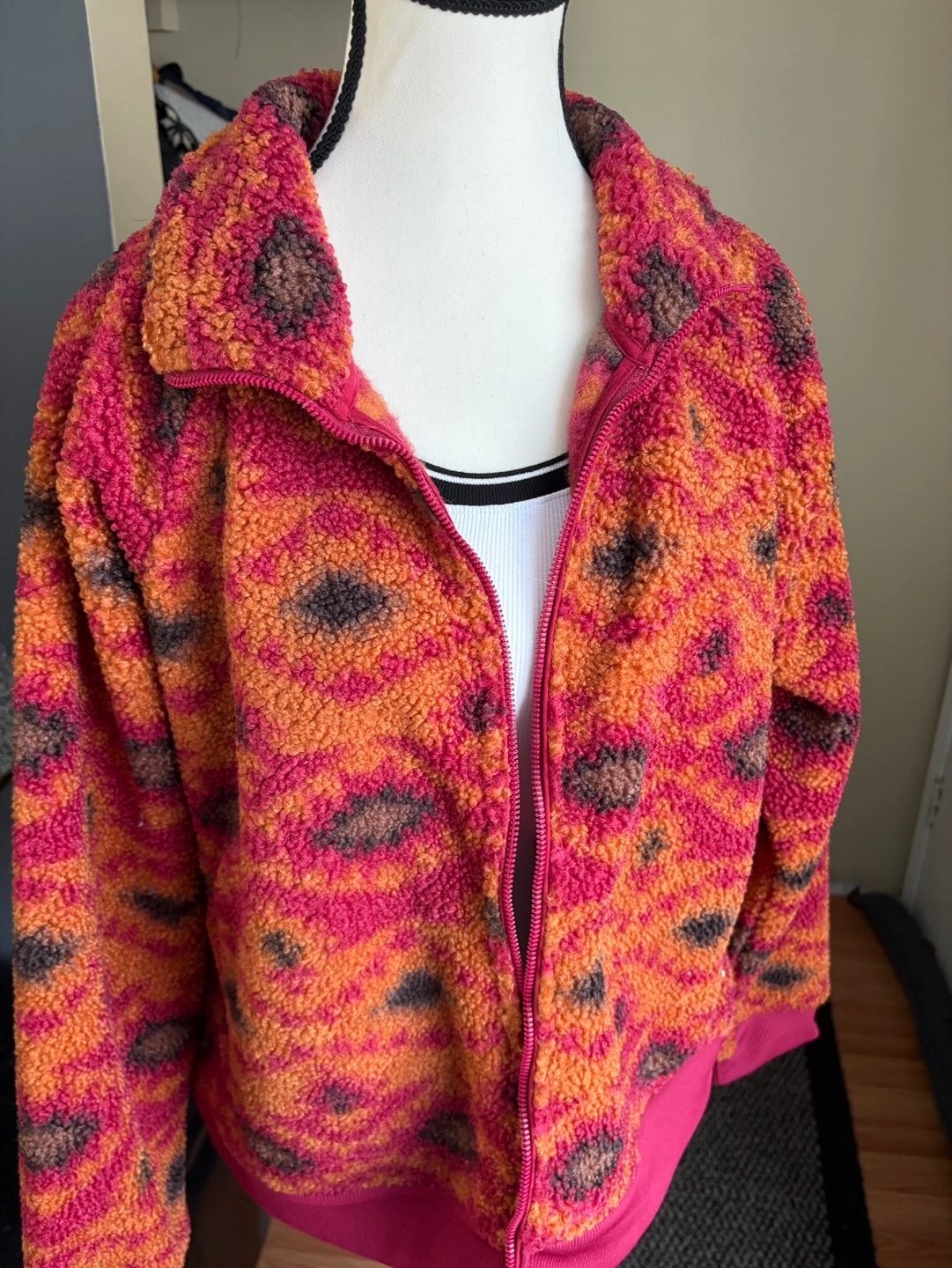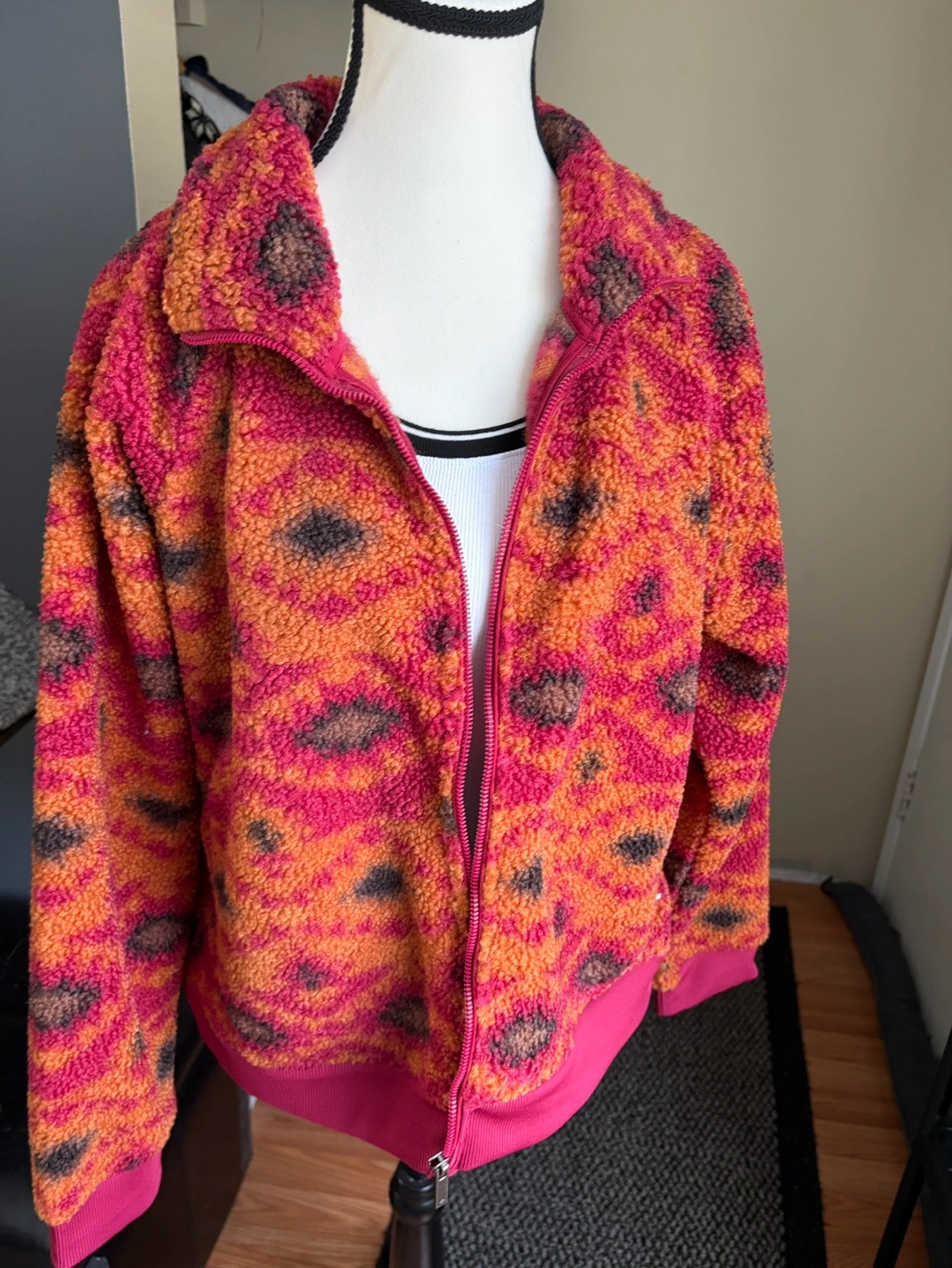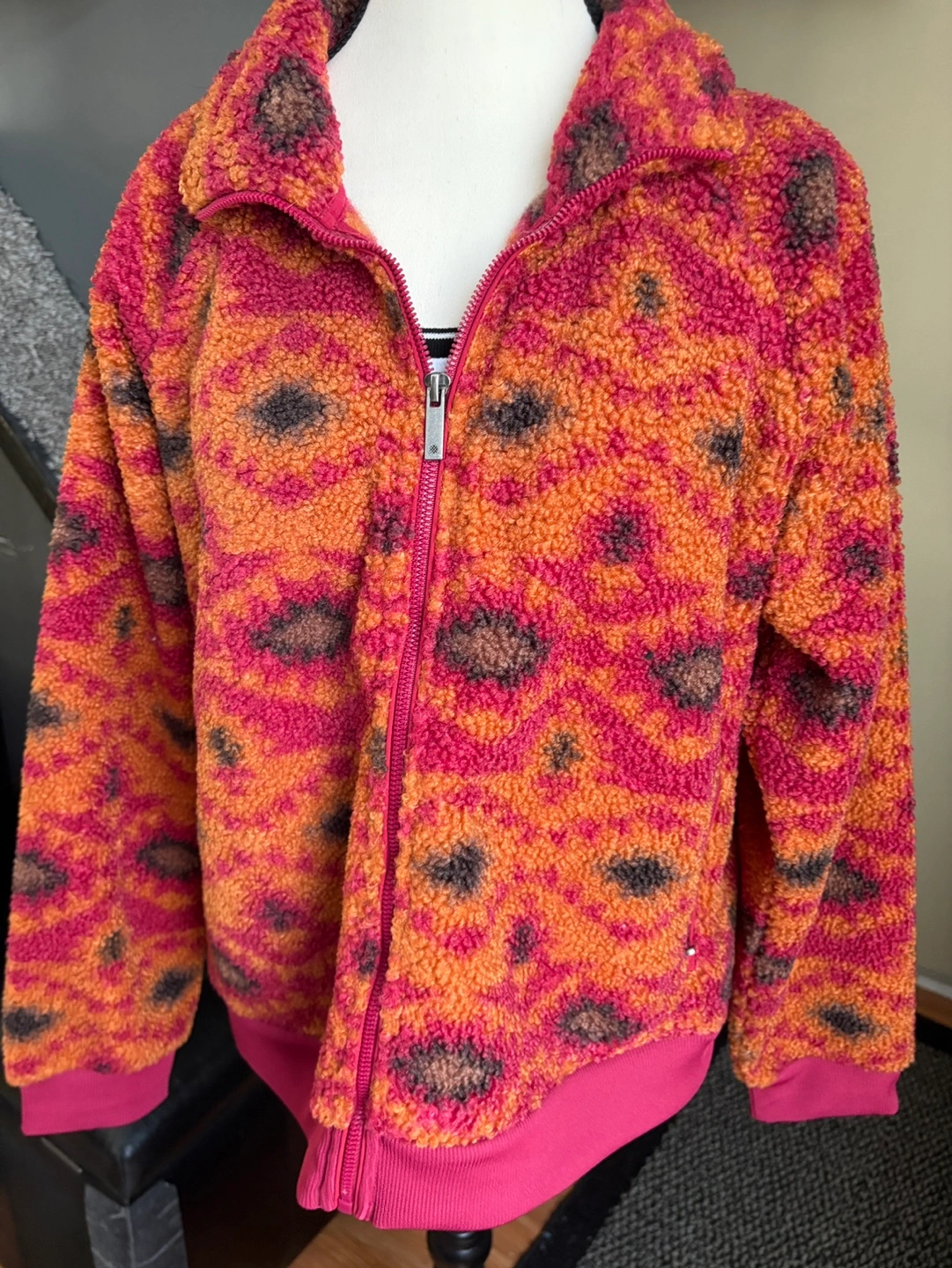 Cozy fleece jacket. Features a full zip closure and long sleeves. Animal print design in shades of pink, orange, and brown. Great for layering during colder months.