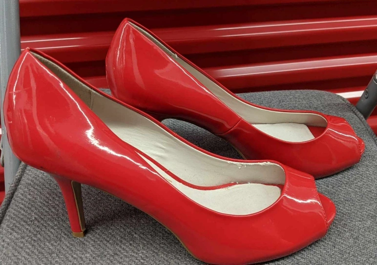 Le Chateau red patent leather peep-toe heels. Size 10M. Slight wear, but generally good condition.