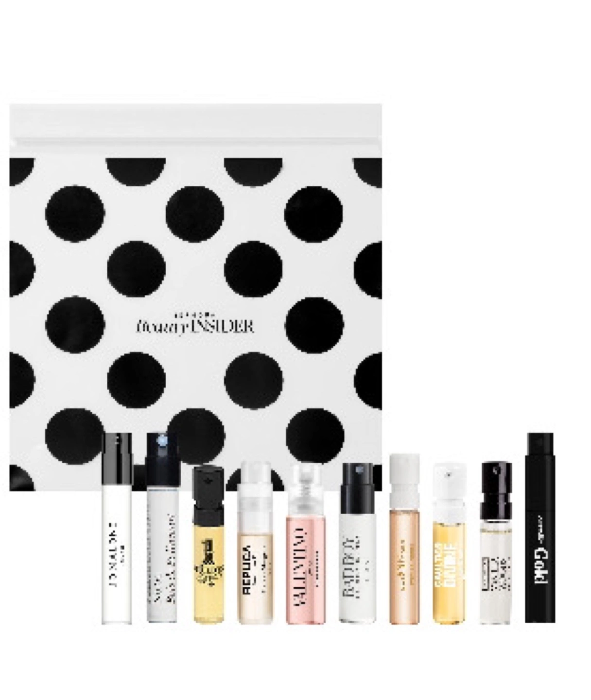 Set of nine mini perfume samples. Various designer fragrances. Comes in a polka dot pouch. Great for travel or trying new scents.