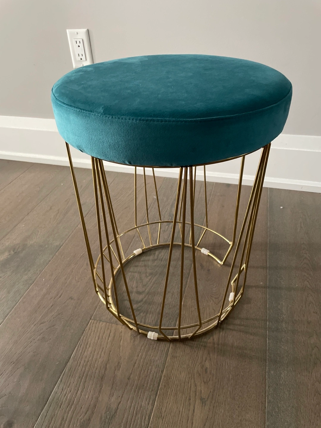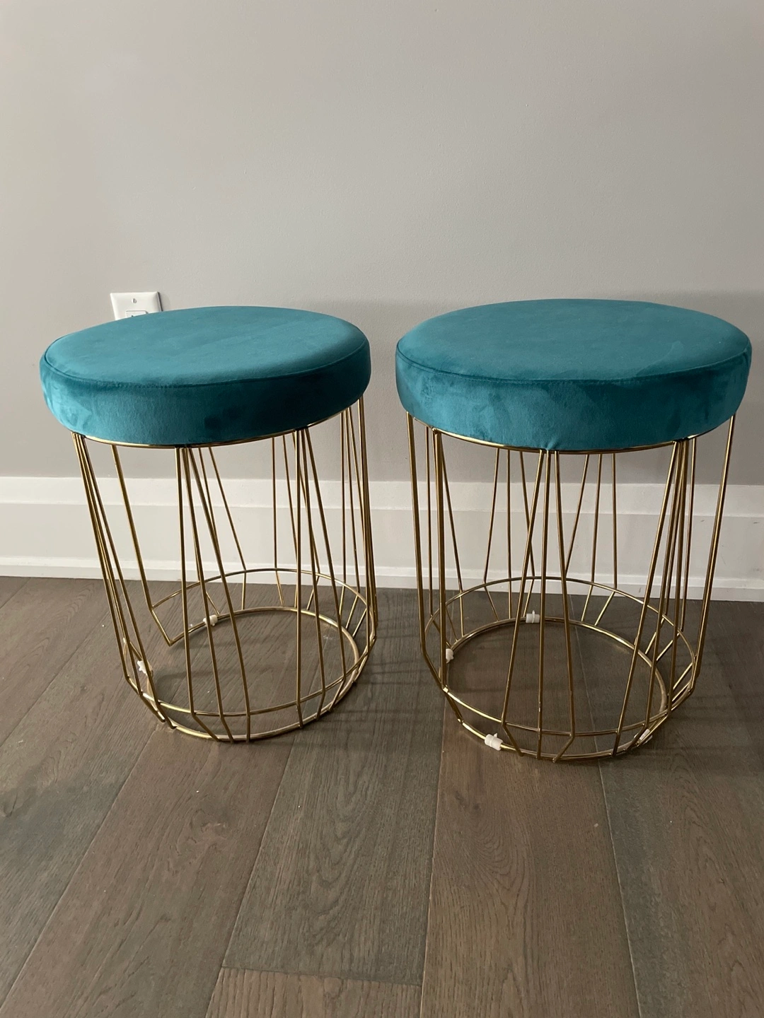 Set of two round teal velvet ottomans. Gold wire frame. Stylish and modern design. Perfect as accent pieces.