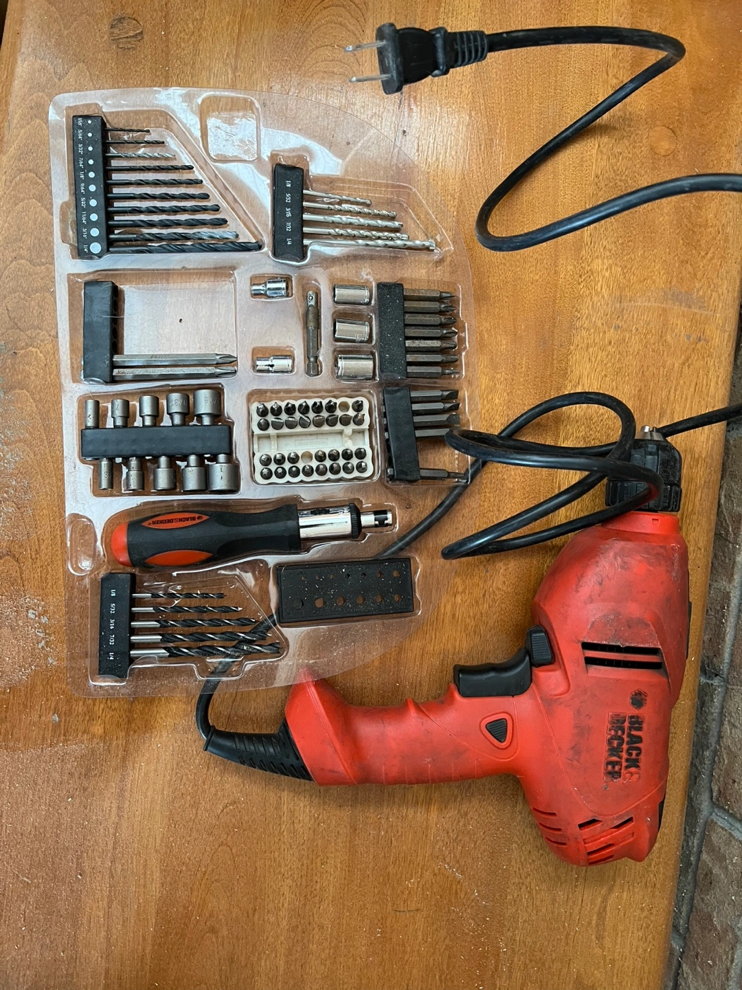 Corded drill, various drill bits, and sockets. Great for home projects. Includes carrying case.