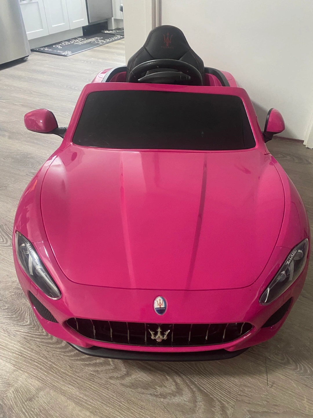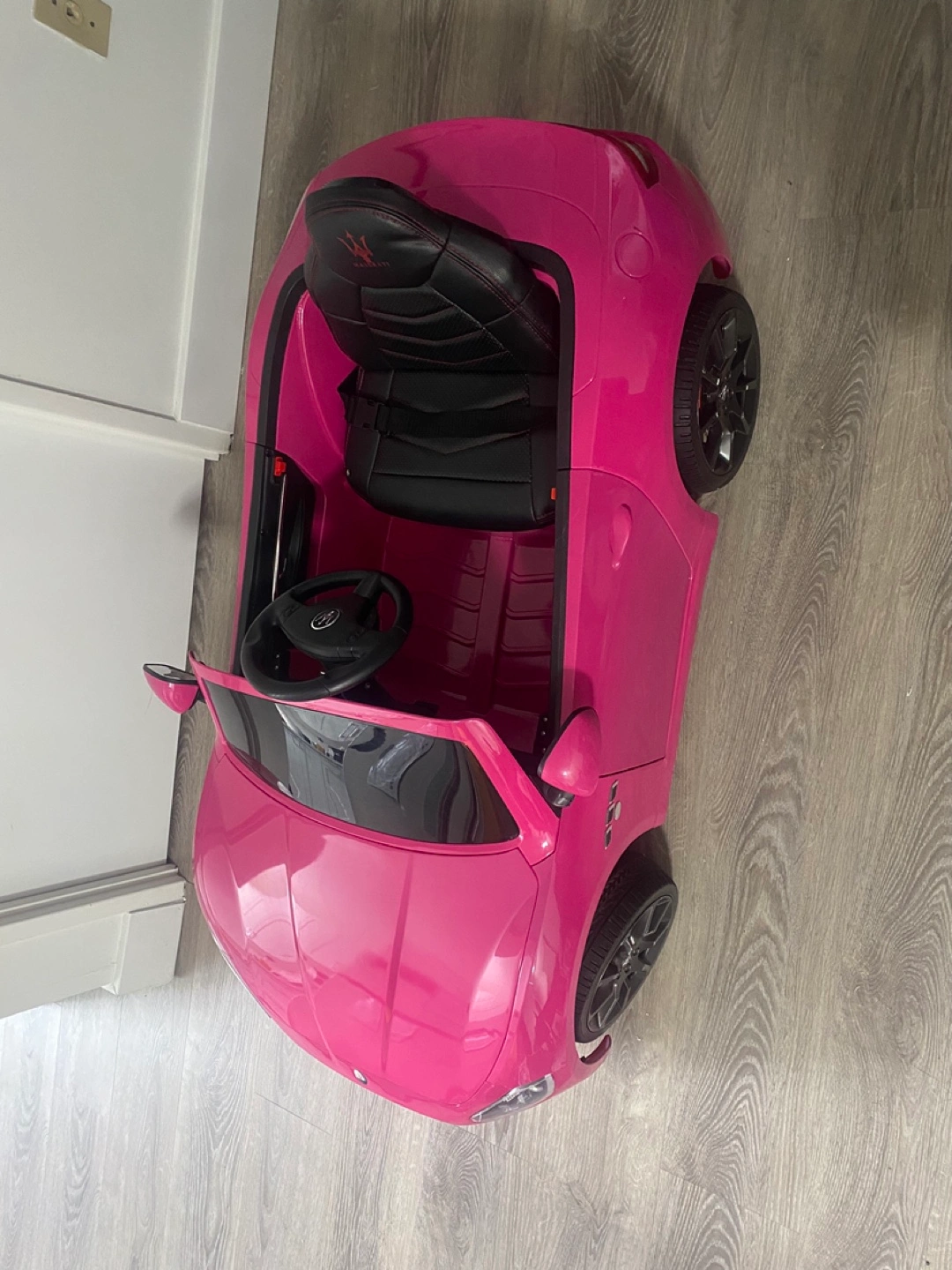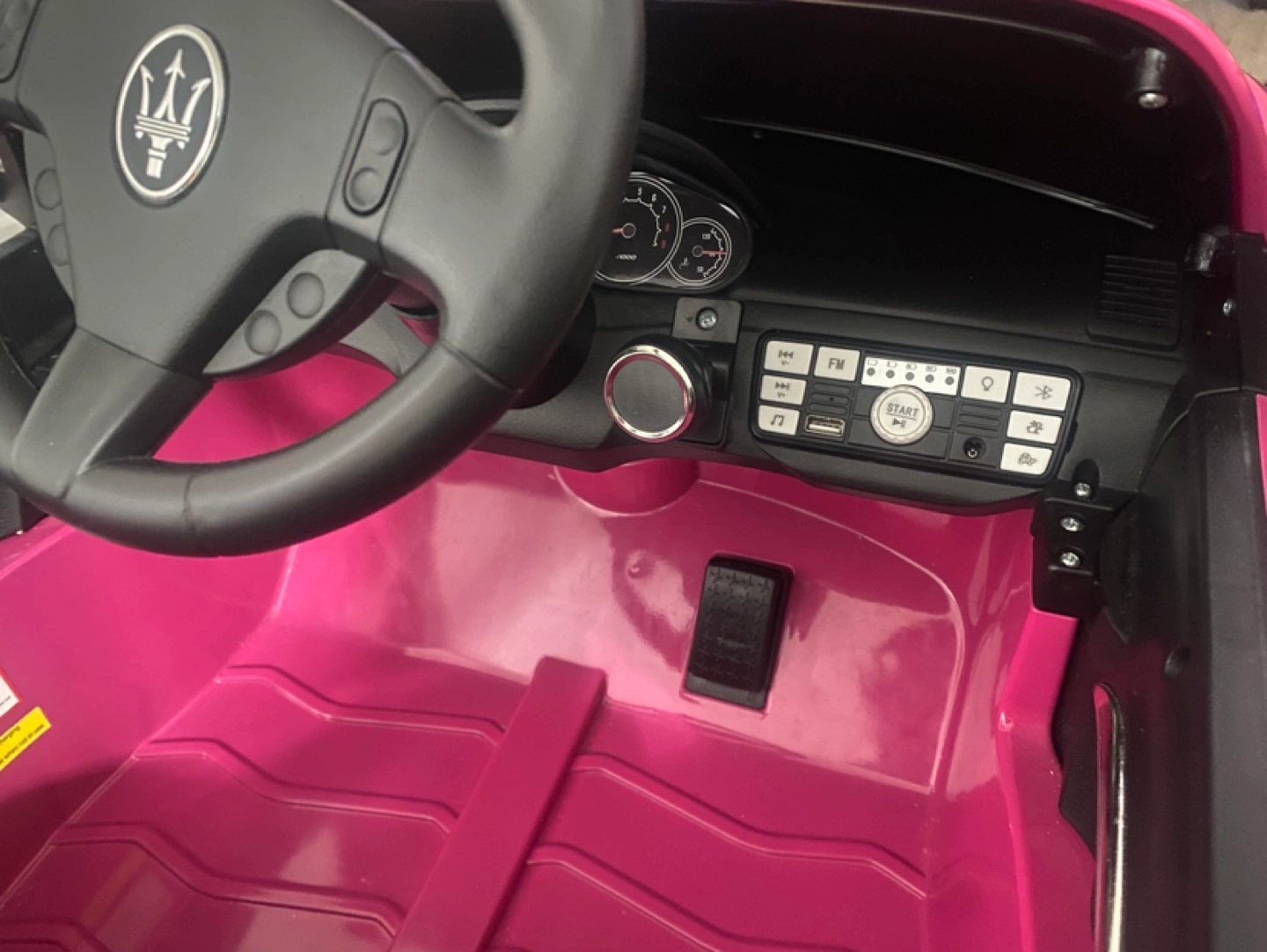 Pink children's ride-on car. Maserati design. Features include Remote Control, working doors, a functional steering wheel, and Bluetooth music player. Suitable for younger children.