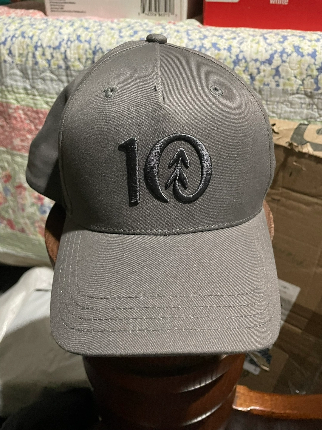 Grey structured baseball cap. Features a black embroidered logo, number 10, and a stylized evergreen tree inside the zero. Adjustable.