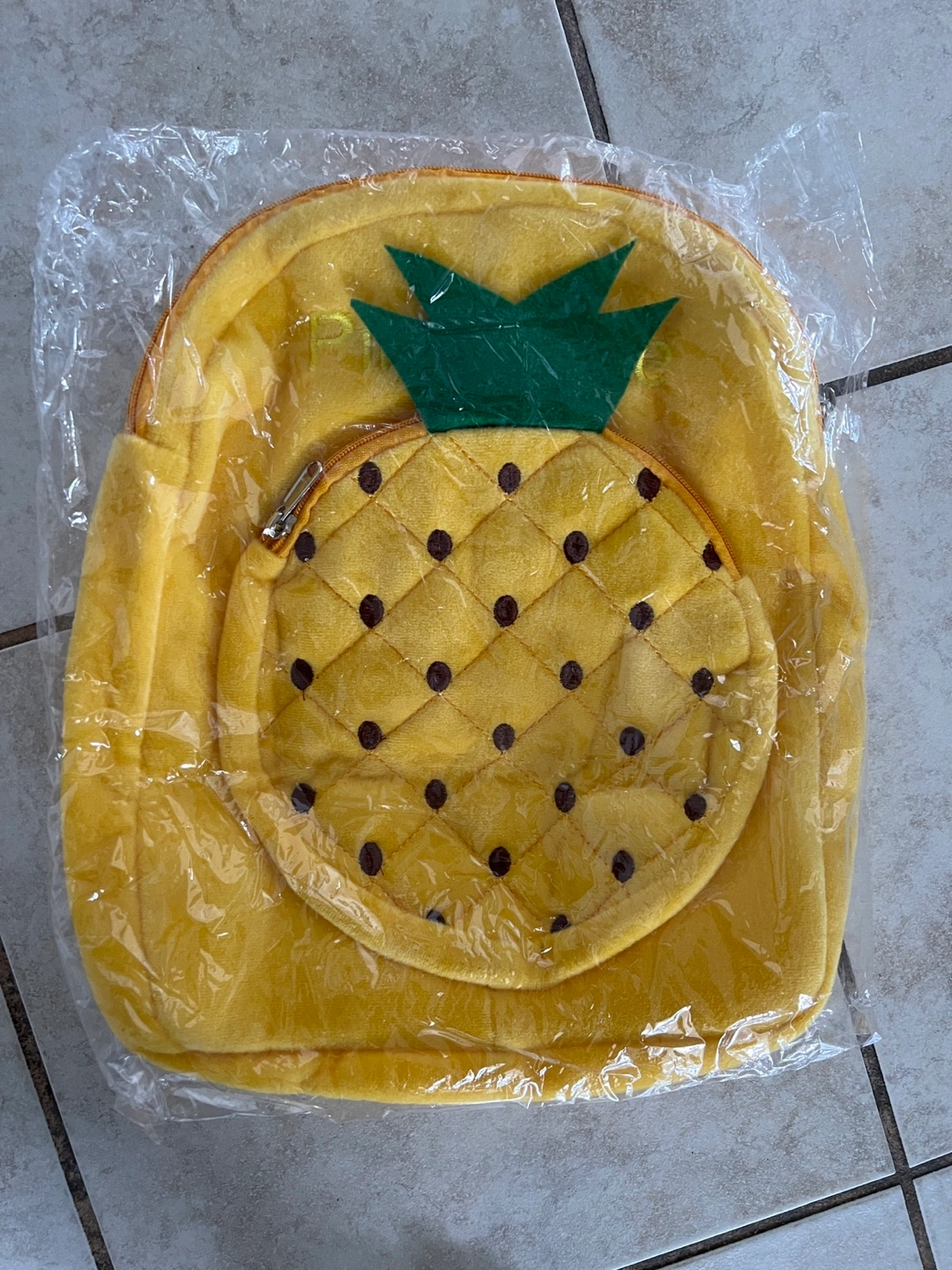 Cute yellow pineapple-shaped backpack. Small size, perfect for toddlers or preschoolers. Velvety soft material. Adjustable straps. Brand new, still in plastic packaging.