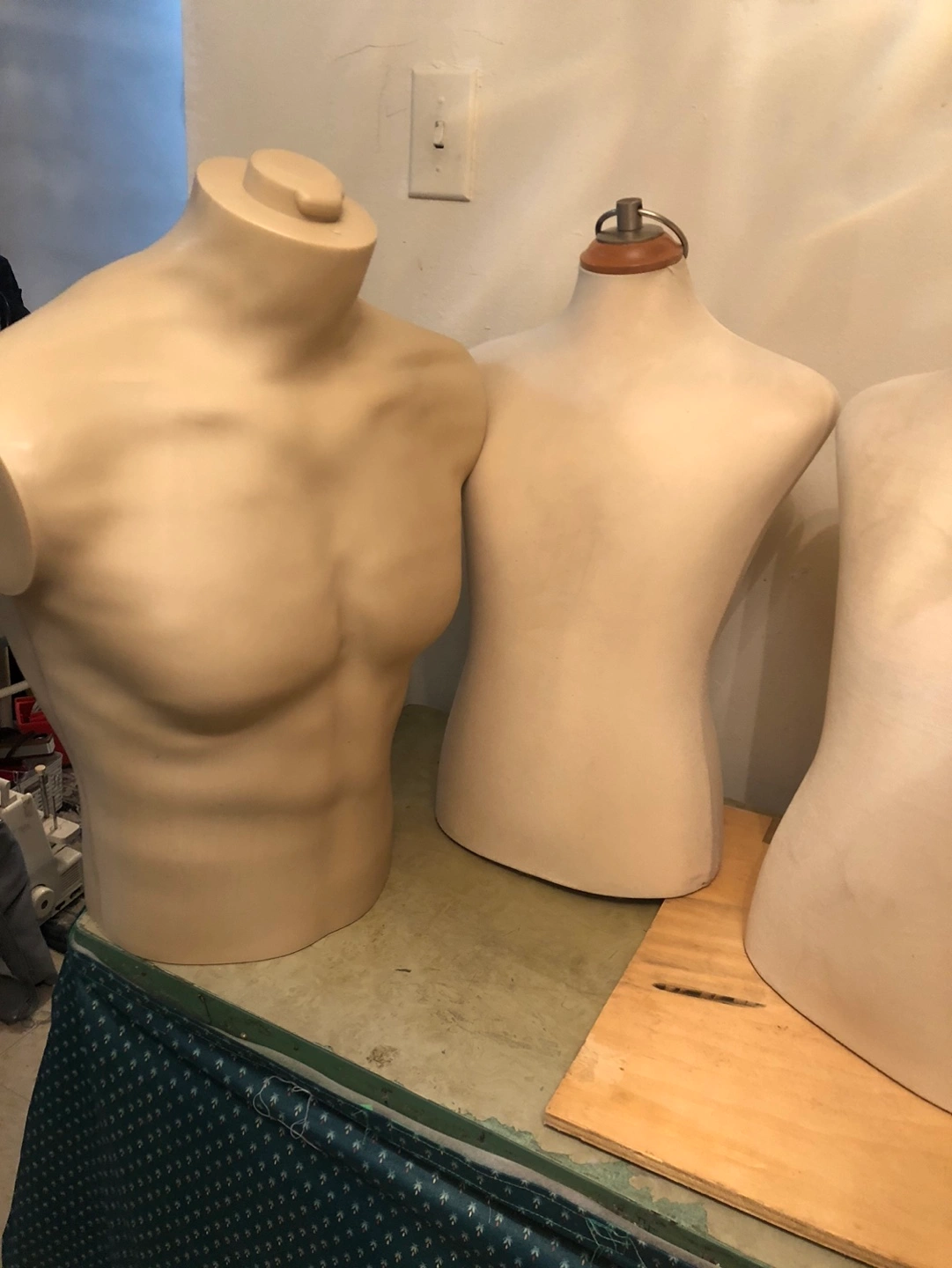 Three male torsos. Two fabric-covered, one plastic. Great for display or sewing projects. Varying sizes. Used condition. $15 each or 3 for $30 2 for $25