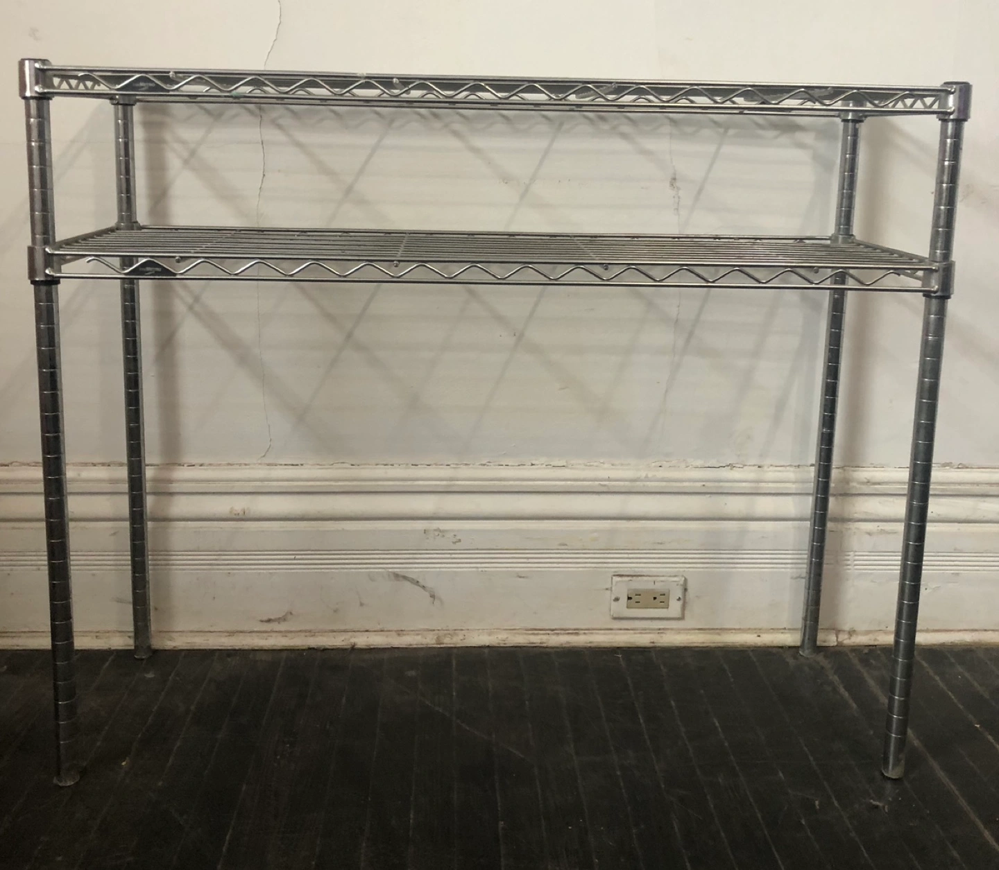 Two-tier shelving unit. Chrome wire construction. Great for storage or organization. Simple assembly.