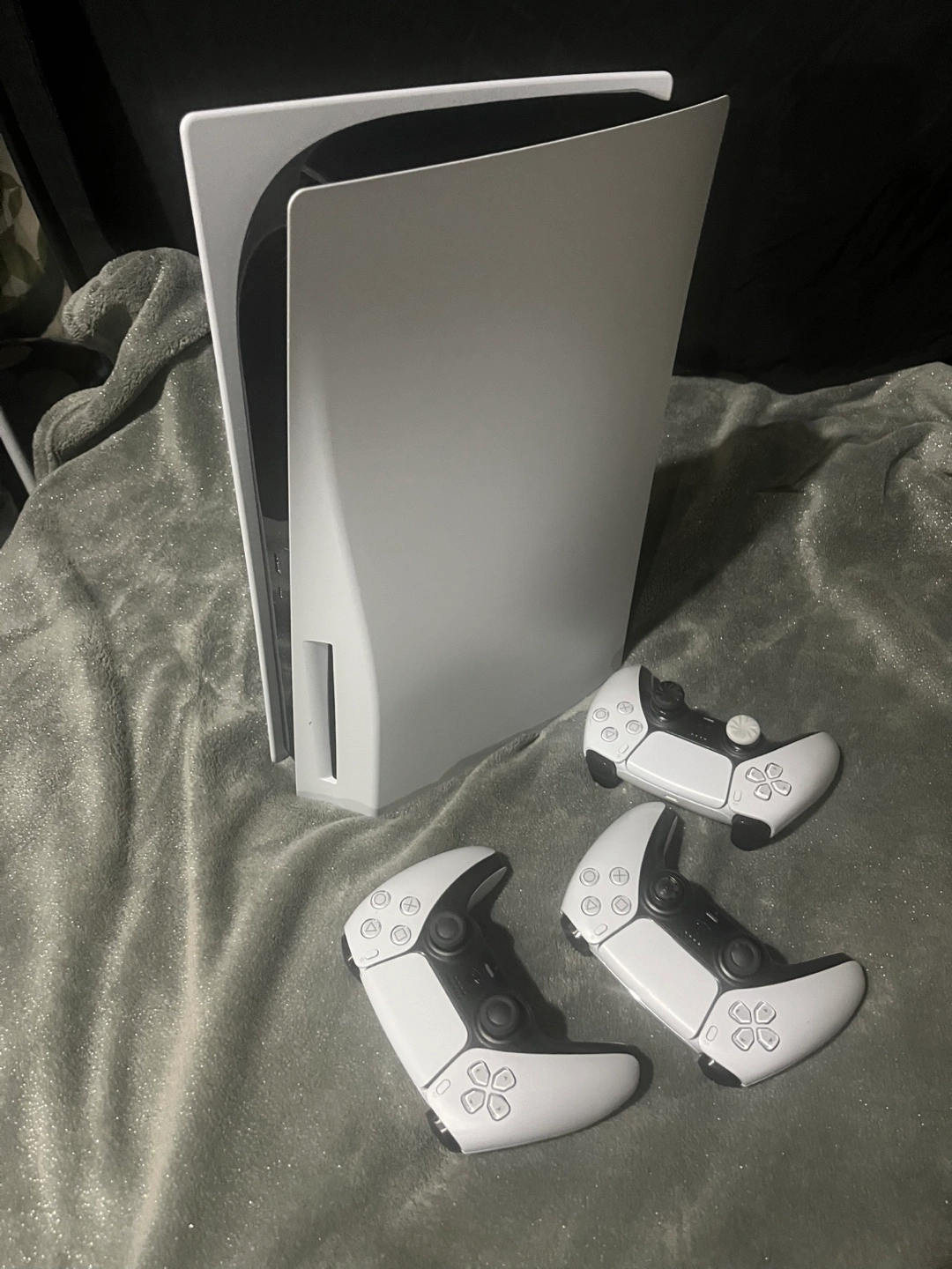 White PlayStation 5 console. Includes three DualSense wireless controllers. Great condition.