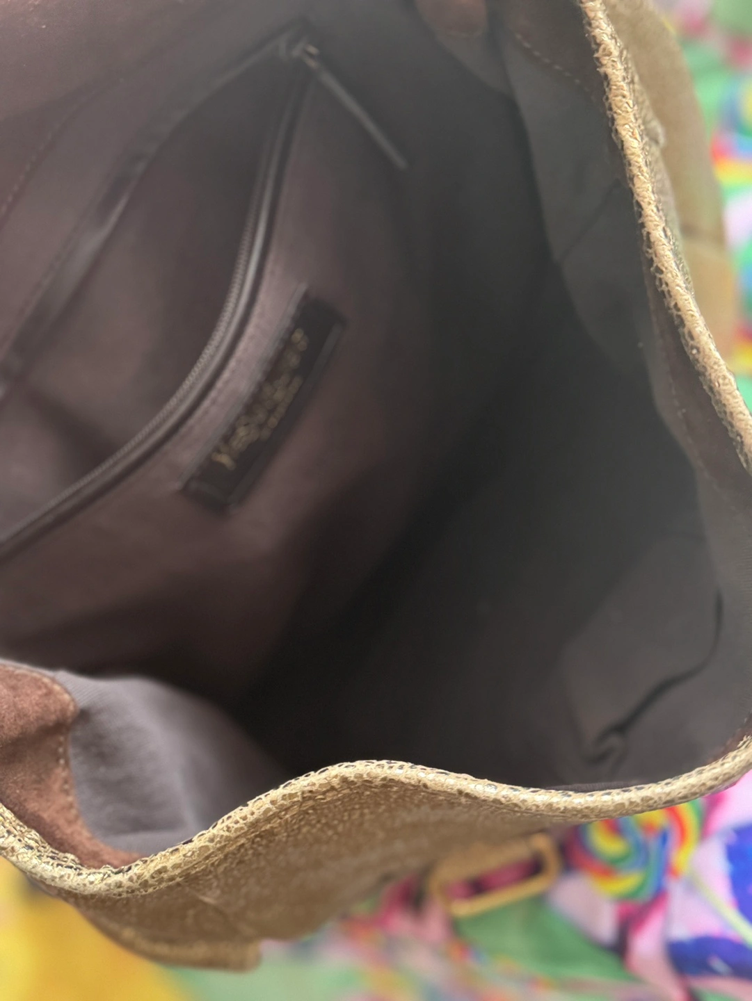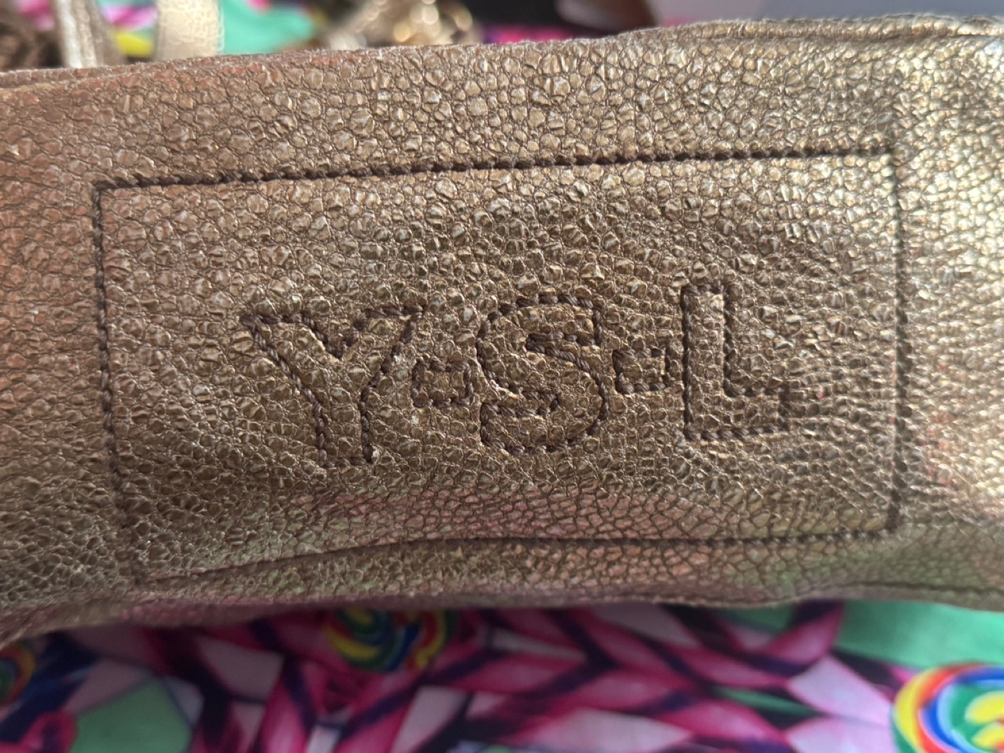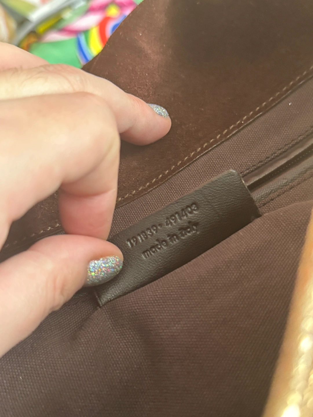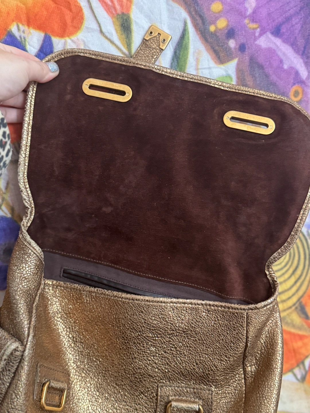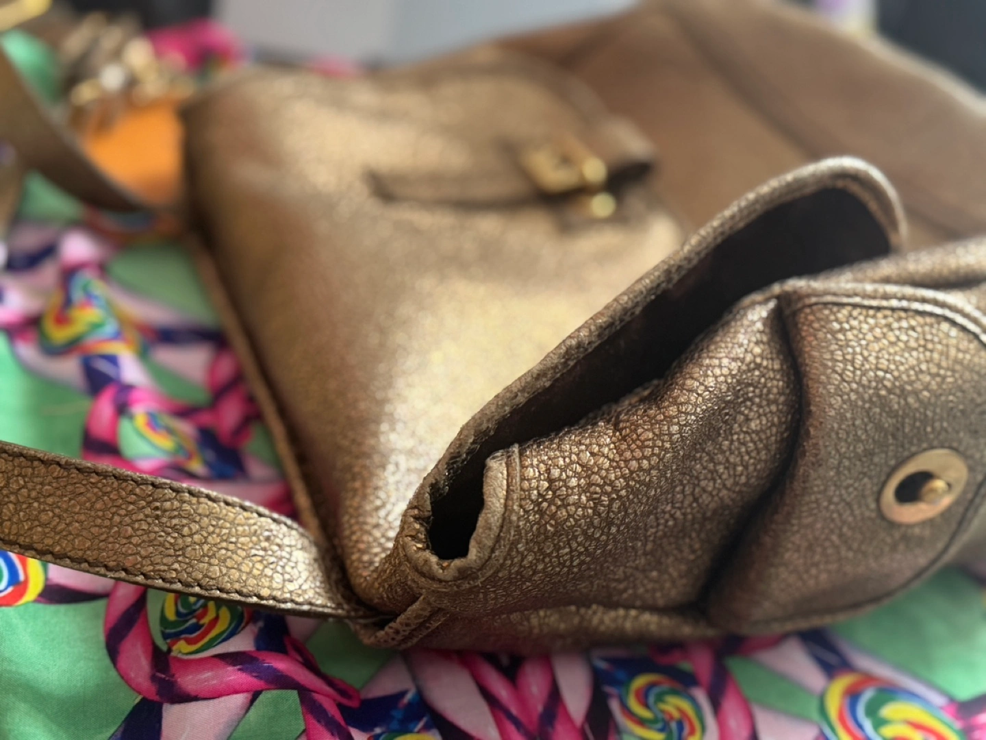 296Pre-loved in great condition Code series: 191839-491403 Made in: Italy Condition: Pre-loved, but in really good condition, with normal signs of wear. Overall, it is in good shape and condition. Features: Gold Metallic Leather, Gold-Tone Hardware, Adjustable Shoulder Strap / Exterior Pocket at Back, Black Fabric and Brown Suede Interior Lining, One Compartment with Flat and Zipper Pocket at Inside, Flap Closure. Colour: Gold Metallic Leather Style: Shoulder Bag Dimensions inches (approx.): Width 33cm / Height 25cm / Depth 10.5cm No smell or odours. Please refer to the pictures for more details as parts of the description. Items Included: Should Bag. ALL SALES FINAL. Please check all photos for details.