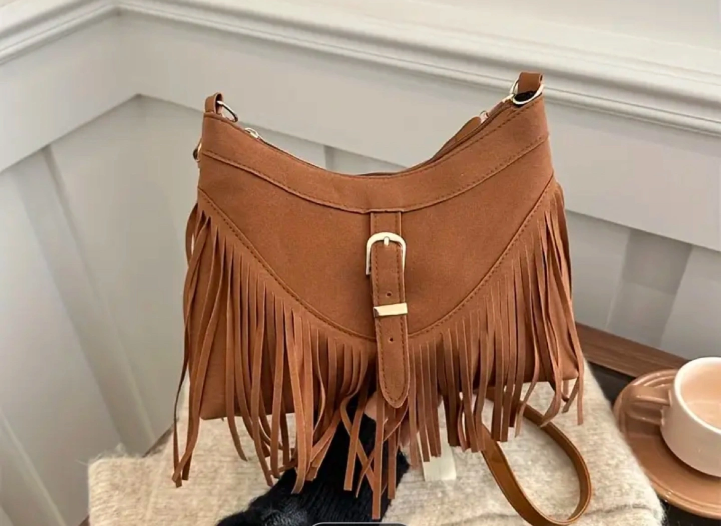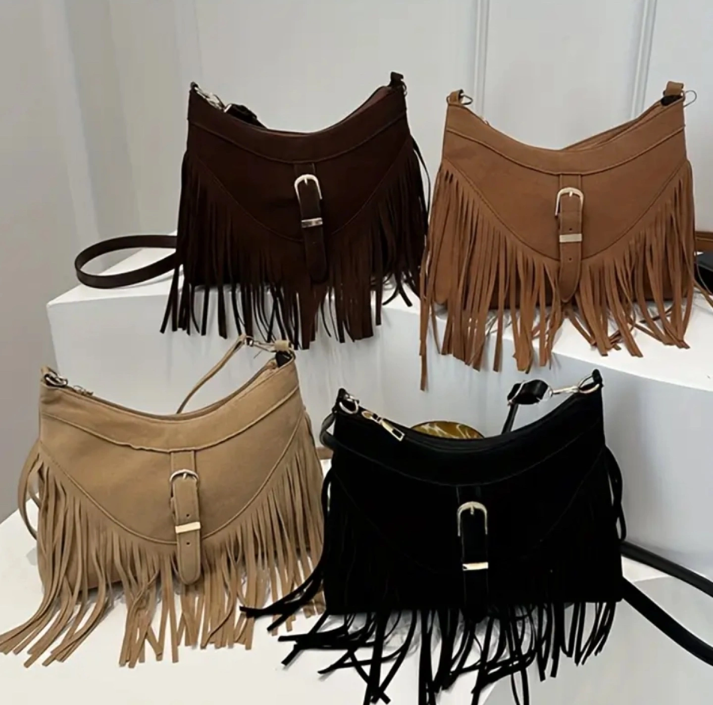 Adorable crossbody bag. Features a suede-like material, fringe detailing, and a gold buckle closure. Adjustable strap. Perfect for everyday use.