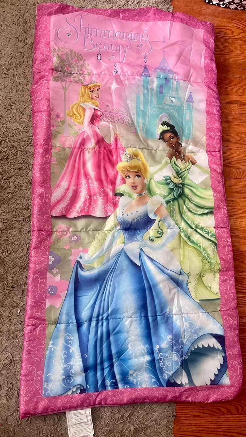 Kids sleeping bag. Features Princess Aurora, Cinderella, and Tiana. Purple lining. Great for sleepovers or camping.