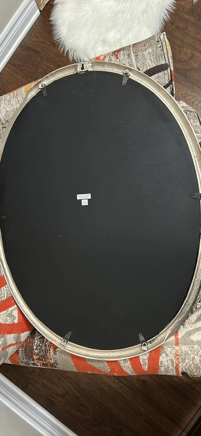 Beautiful oval mirror. Features a silver-toned, ornate frame with leaf-like detailing. Perfect for adding a touch of elegance to any room. Wall-hanging mirror.