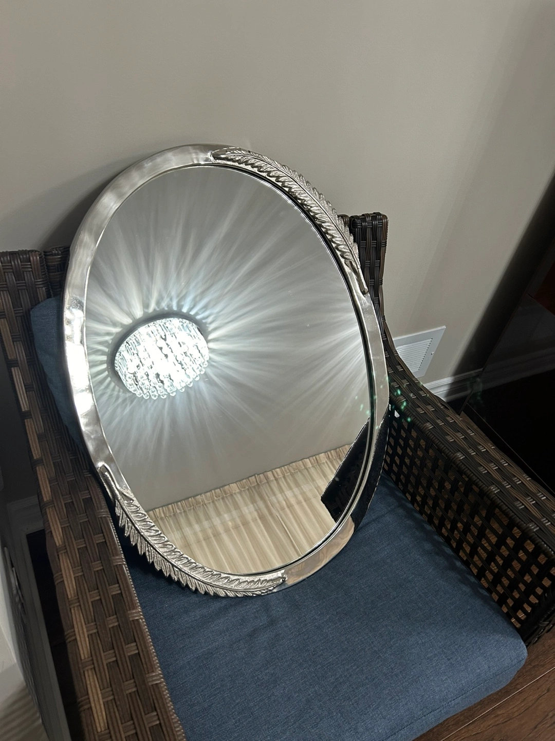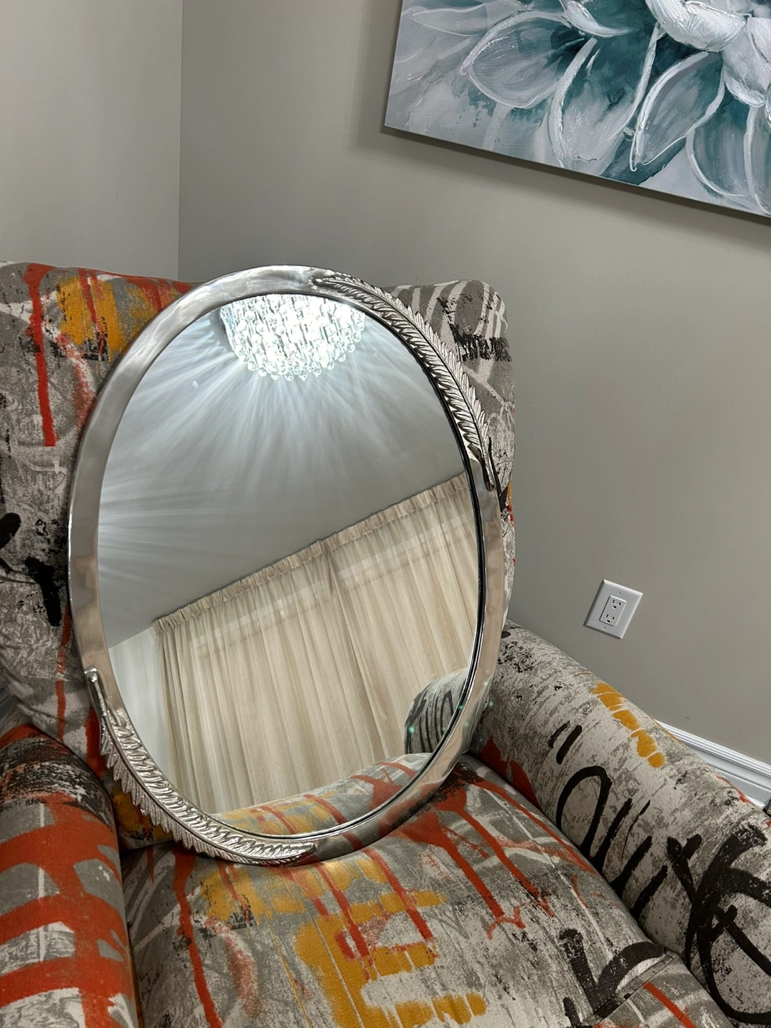 Beautiful oval mirror. Features a silver-toned, ornate frame with leaf-like detailing. Perfect for adding a touch of elegance to any room. Wall-hanging mirror.