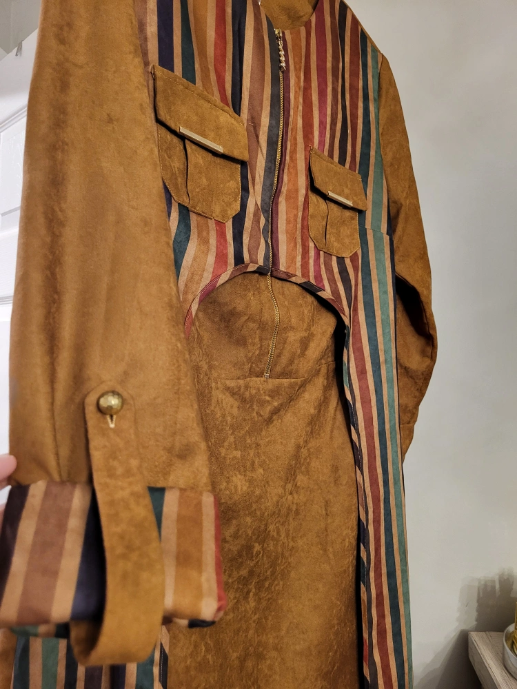 Long-sleeved dress. Features a keyhole detail at the waist. Multicoloured vertical stripes down the front and back. Brown suede material. Gold zipper closure. Two front pockets. $25.