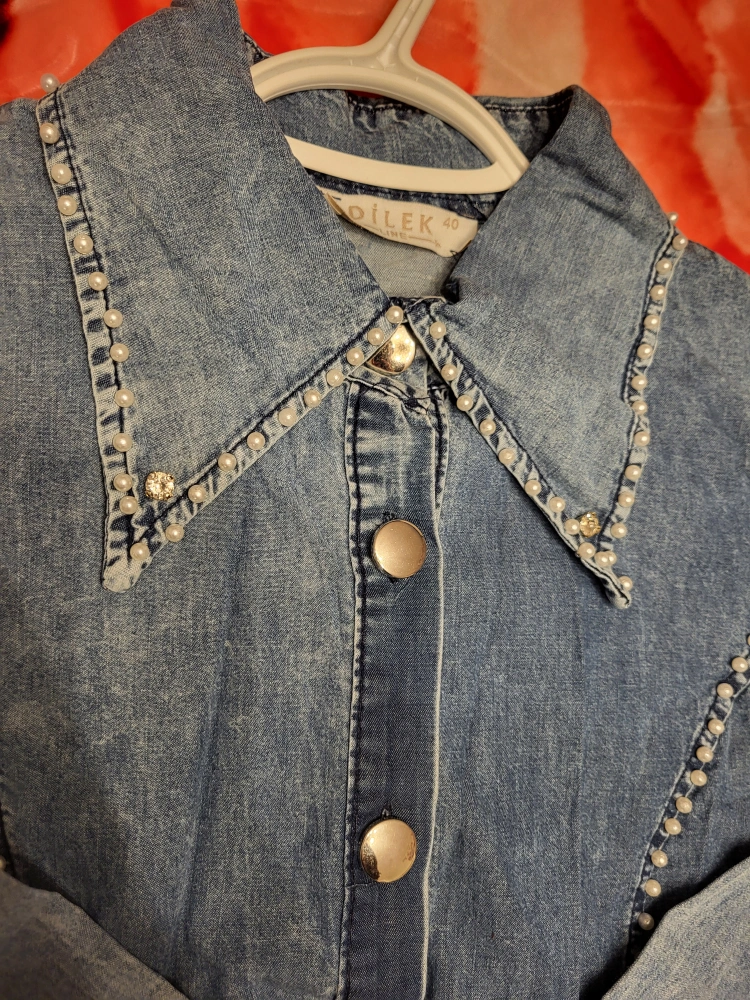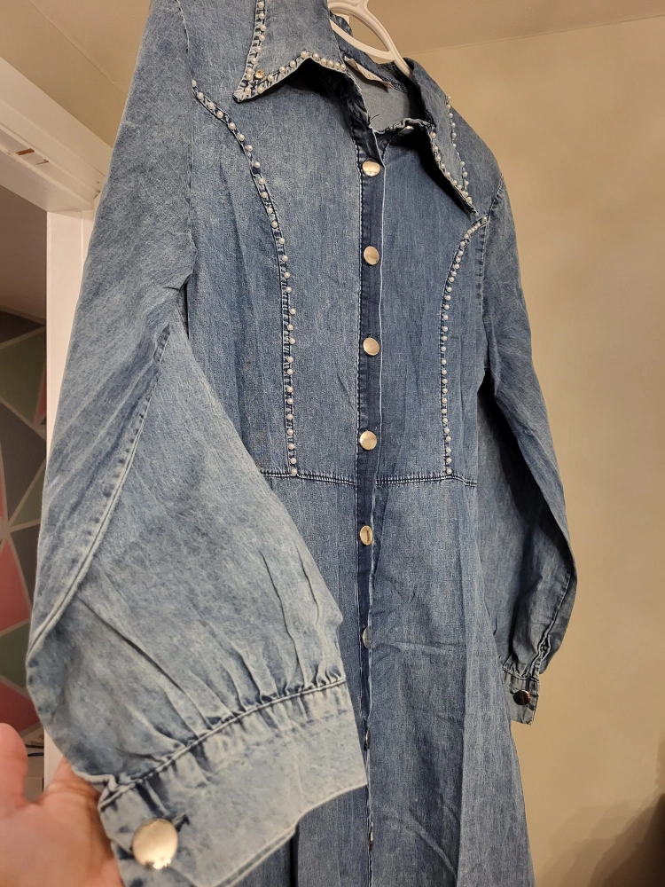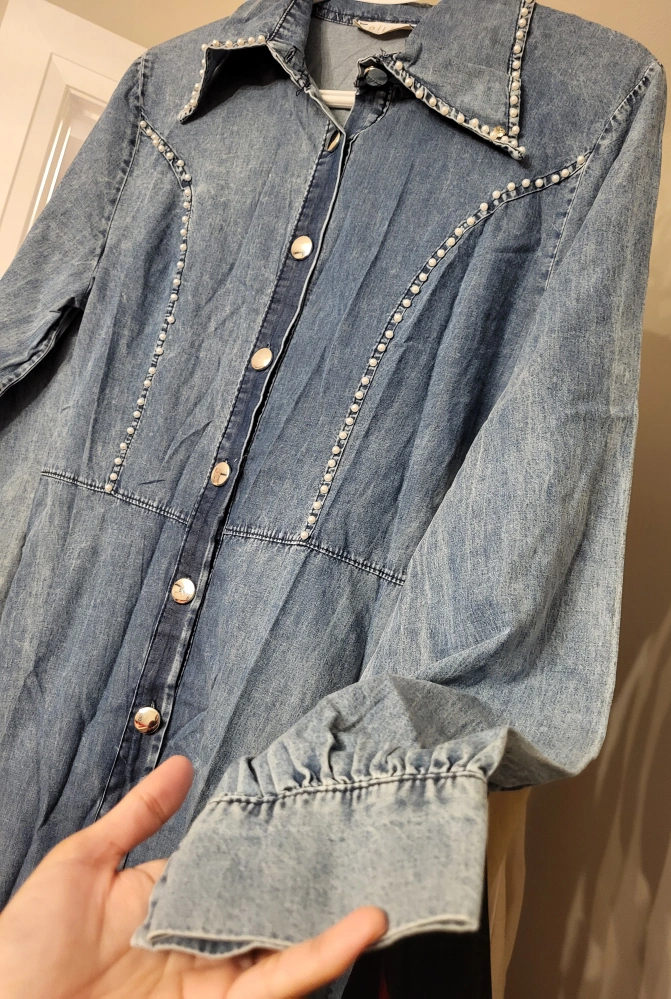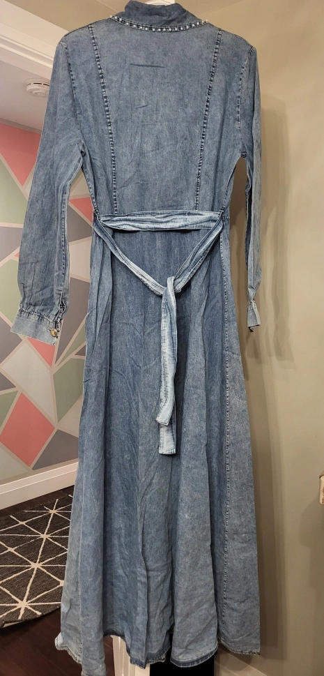 Light wash denim dress. Features long sleeves, button closure, and a self-tie belt. Embellished with pearl accents around the collar and down the front. Size 40. $65