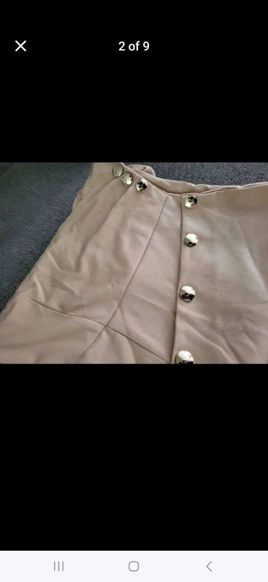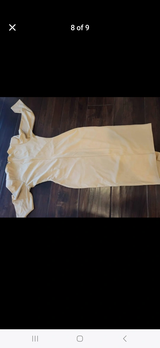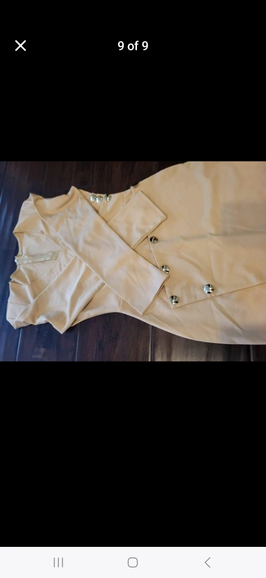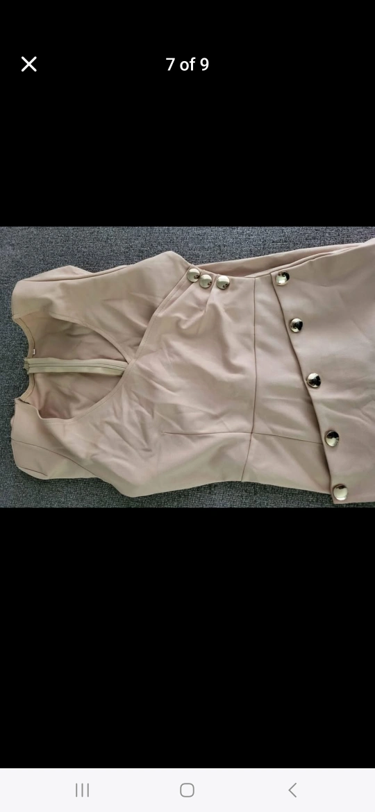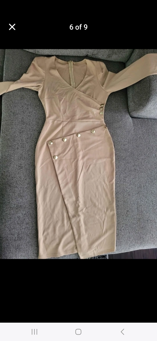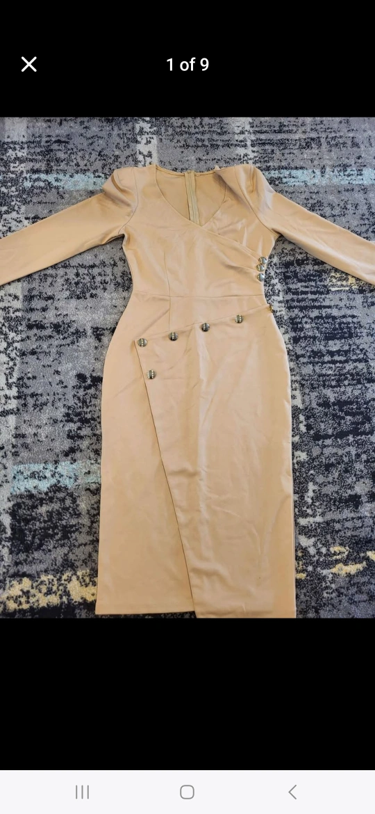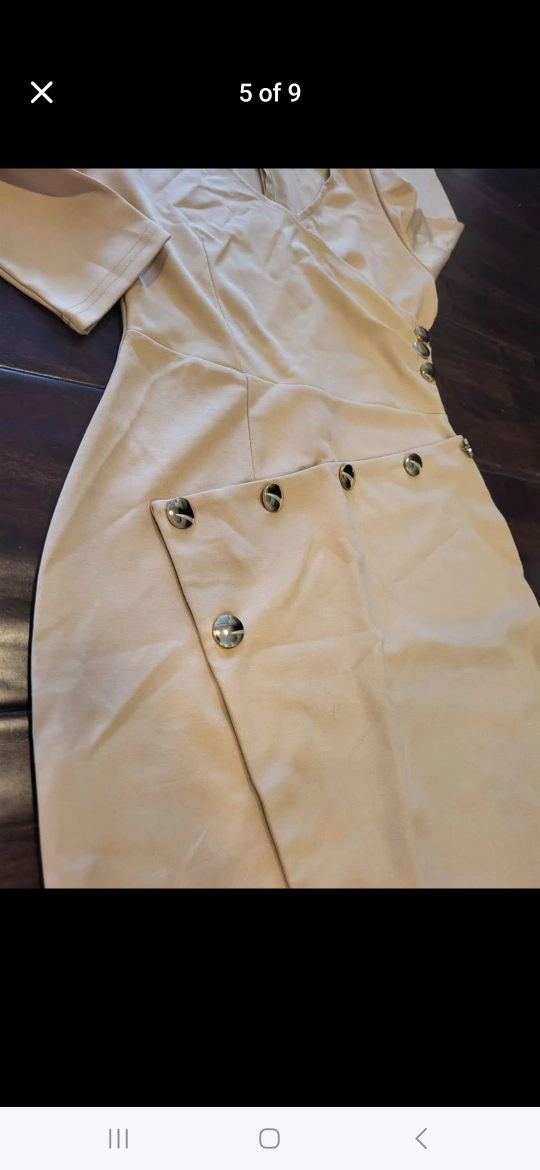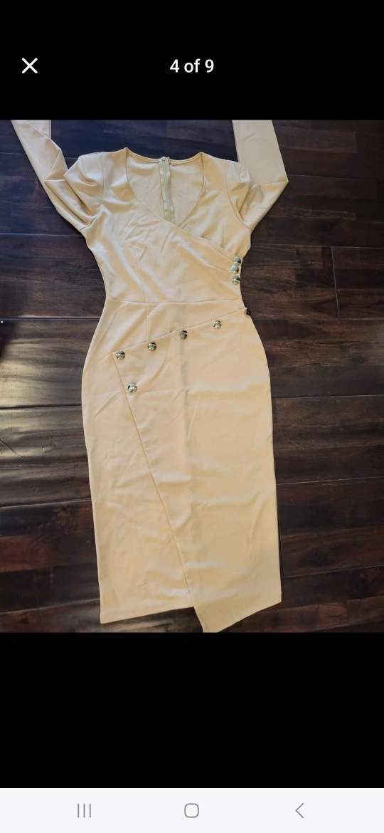 Long sleeve midi dress. Beige colour. Features a V-neck and asymmetrical hemline. Gold-toned buttons on the side. Zipper closure at the back. $20.