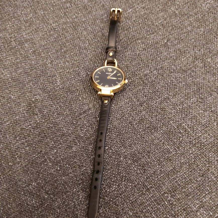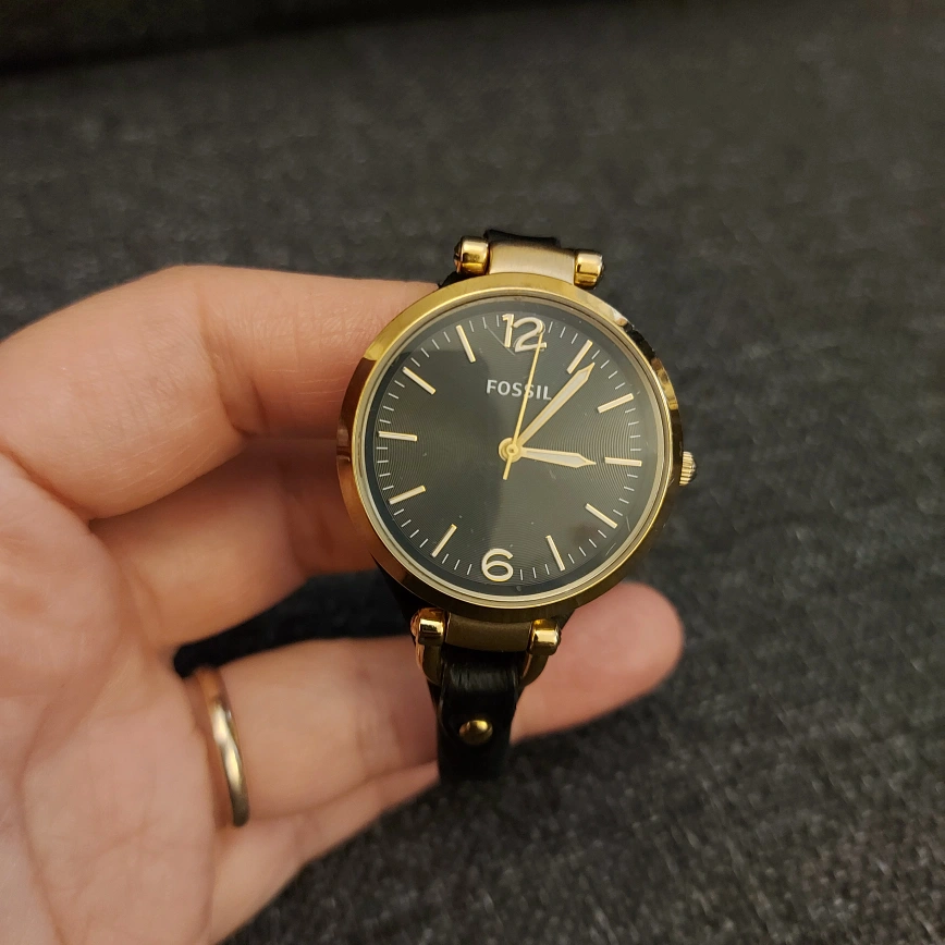 Women's watch, black leather band, gold-tone accents. Analogue display. I've had this watch for decade and does not work - battery needs to be replaces. The "2" in the 12 is falling off the face of the watch. The leather strap is degrading. Could be great for someone into watch repairing. Pick up at Pape Station. Cash only.